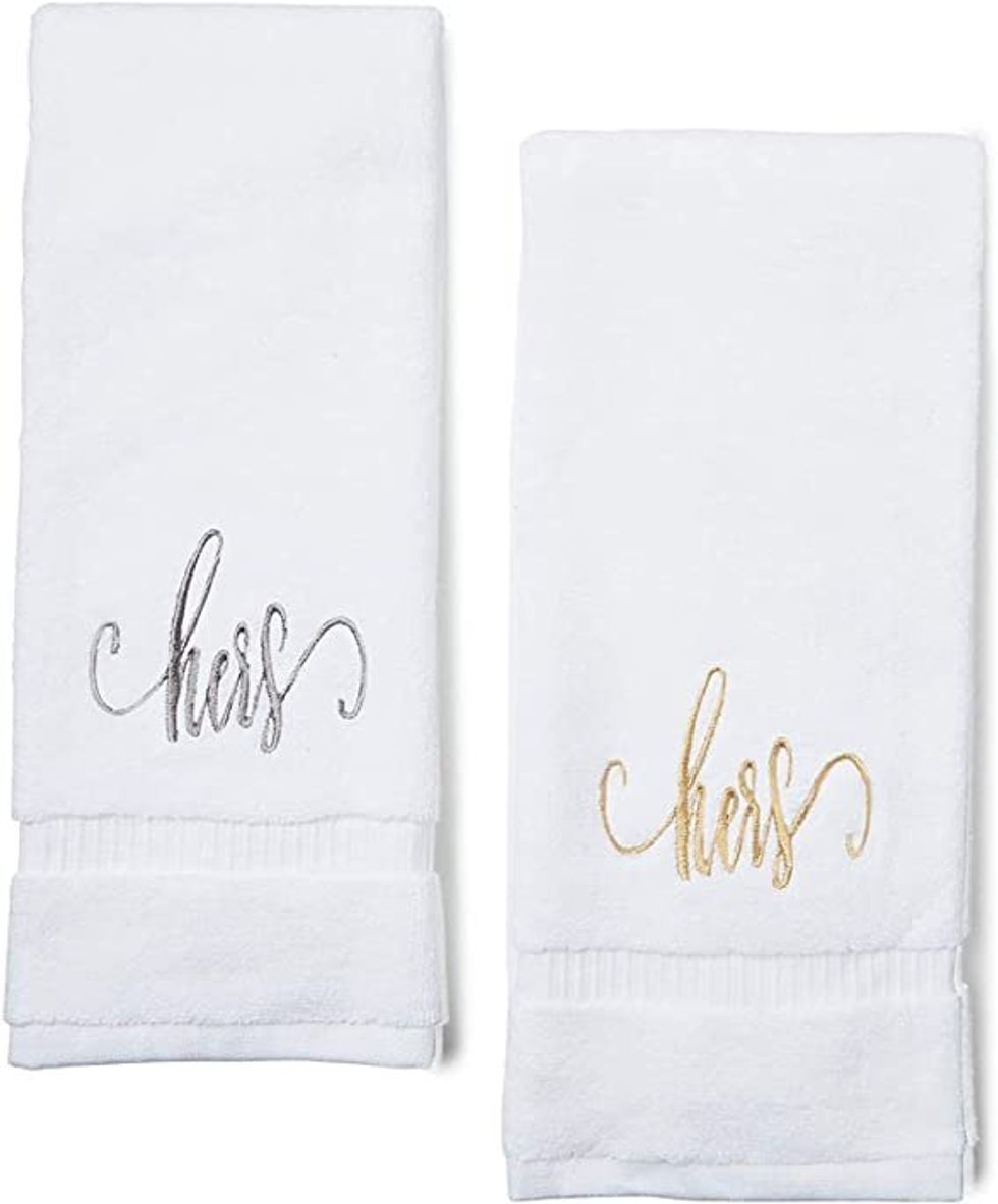 What a bathroom's hand towels represent says a lot about the space to guests in one's bathroom. Like the shower curtain, hand towels offer one of the few ways to personalize a bathroom. Show the pride you have in your partner with these "His & His" towels, embroidered in gold.