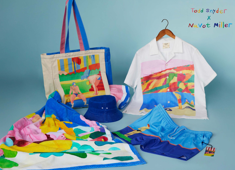 Todd Snyder has teamed up with queer artist Navot Miller for a Swim Short and Panama Shirt combo with one of Miller's bold designs. 100% of the purchase price of the collection will be donated to support Visual AIDS, a non-profit that uses art to fight AIDS.