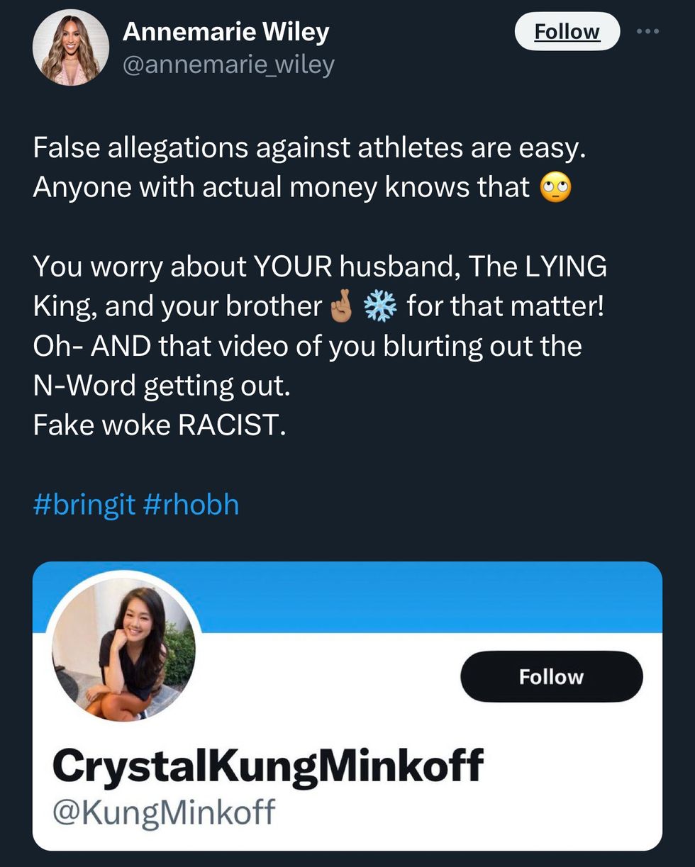 Minkoff has become quite the topic of conversation on X (formerly Twitter) lately. A troll page/parody account with her name and photo had some VERY choice words for fellow ex-Beverly Hills housewife Annemarie Wiley. In turn, Wiley took to X with her own choice of words, attacking not only Minkoff, but members of her family as well. It's not clear if Wiley knew the parody account was not actually Minkoff's actual, official account, however... most of the general public and online fans were able to figure it out.