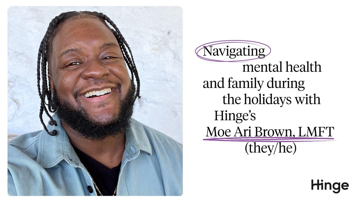 The holidays are upon us, which means spending time with loved ones. As an LGBTQIA+ person, the holidays can be profoundly lonely when we don't have people to come home to. But don't let that stop you from living a healthy and happy life. Thanks to Hinge's Love and Connection Expert, Moe Ari Brown (they/he), there's a lot we can learn about putting our mental health first and creating a chosen family for ourselves. As a Licensed Marriage and Family Therapist (LMFT), they bring together their experiences as a transgender non-binary person, their years of clinical experience, and all of their creative gifts to help others live their most authentic and connected lives.