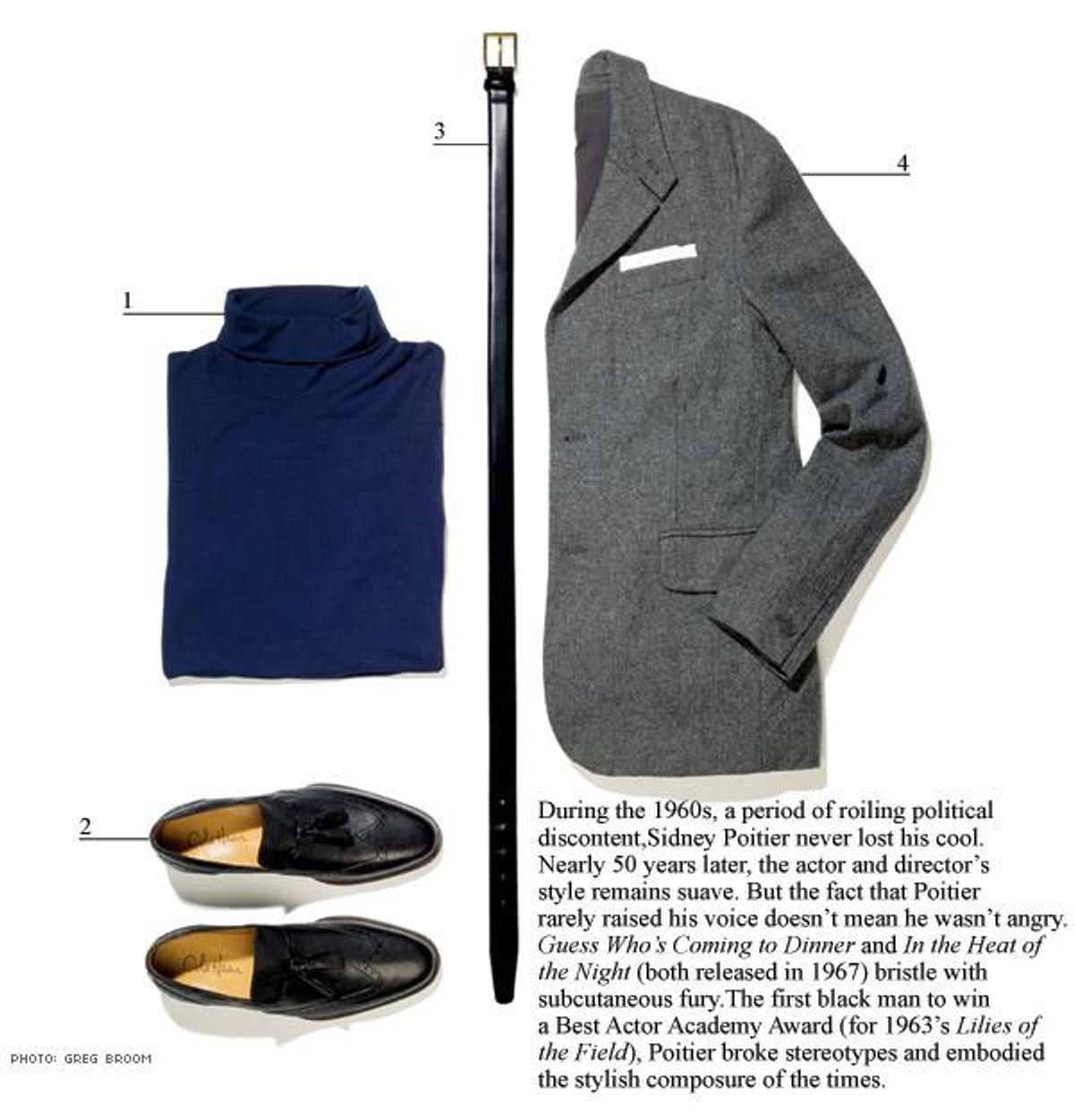 Only Poitier could make the pocket square trendy. Tucked into this relatively unstructured beatnik pureDKNY blazer ($325), a white linen square by J. Crew ($38) lends an air of dignity and quiet formality.