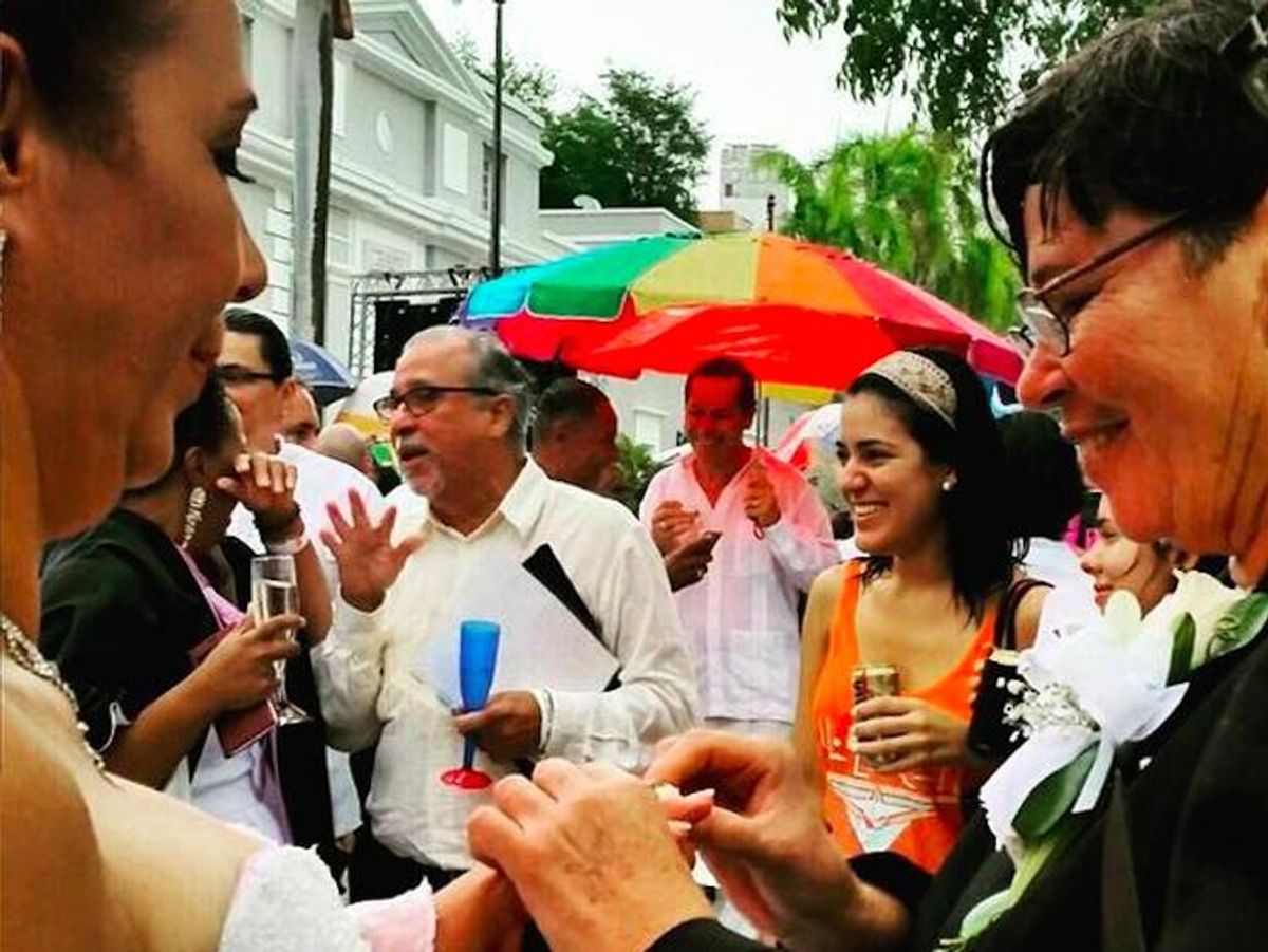 It hasn't been a straightforward journey for Puerto Rico's LGBT community. In 2014, Judge Juan Perez-Gimenez broke rank with the First Circuit Court of Appeals, under which Puerto Rico falls, and upheld the United States territory's same-sex marriage ban. However, after a number of appeals and stays, this summer's landmark Supreme Court ruling finally brought marriage to the Caribbean archipelago. In honor of the victory, more than 60 couples were wed in a mass ceremony on Sunday in San Juan, the capital city.