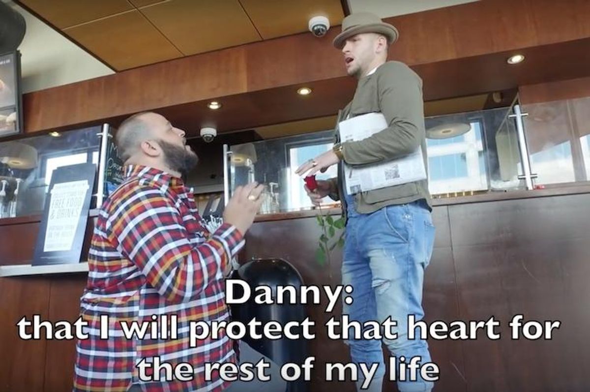 Actor Daniel Franzese, who created the character of Eddie in the Looking series (don't miss the highly anticipated finale movie now streaming on HBO), met his boyfriend Joseph over a year ago at a North Hollywood Starbucks. Last week, Daniel conspired with the baristas to slip an extra cup to his love when their coffees were ready. In the mystery cup? A ring, which Joseph was shocked to receive. The rest is matrimonial bliss.