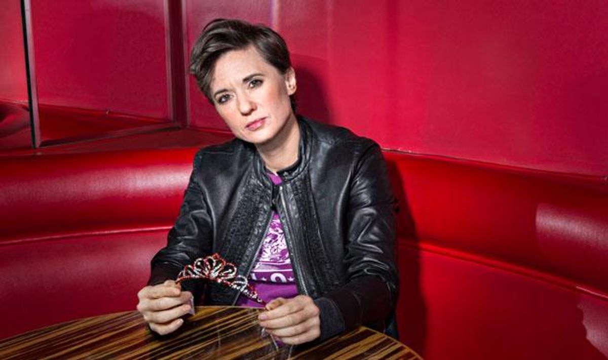 Still, she can point to some ways her queerness works in her favor: teaming up with straight guys. She's developed a butch/femme lesbian romantic comedy with Judd Apatow, who executive-produced both the girl gross-out mega-hit Bridesmaids and HBO's breakout comedy Girls. "The butch and femme fall madly in love," she explains, "and they have all these complications -- and there's a number of straight guys who come to their aid."
