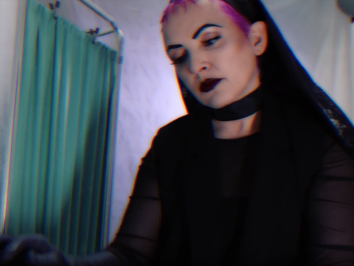 Just in time for Halloween month, Elettrodomestico's "Nightblind" video features a gang of bloodthirsty nurses, led by Wiedlin, who abduct, torture, murder and dump Pietro's male character. The lo-fi mini-horror film is directed by visual artist Chrissie Dieu, whose alter-ego Black Plastica certainly informed its grim, campy S&M-inspired imagery.