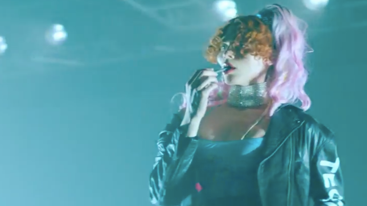 "Ponyboy," in contrast, nearly drowns out every word in fantastic, overwhelmingly animalistic synthesizers. The song's lyrics are gloriously dirty, kinky and playful. "Ponyboy" sees SOPHIE on a stage, playing with a whip, applying lipstick, and engaging in some gymnastic, menage a trois choreo with two backup dancers, who happen to be acclaimed performance duo FlucT.
