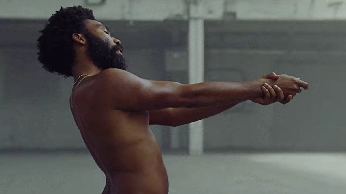 The new track is titled "This Is America," and the video, which is shot in almost a single take, takes the viewer on a frightening journey that at first seems to be just fun choreography before Glover turns and begins shooting his fellow dancers with assault weapons at random.