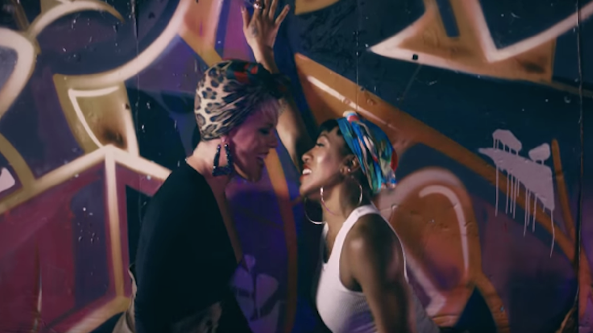 The video sees her alongside dancers in front of a graffiti wall--P!nk herself gets hot and heavy with another woman, and two male dancers basically go for it without taking off their pants.