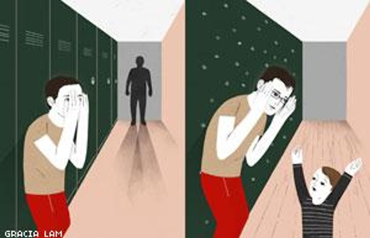 It's a feeling I haven't had since I was 11, one that floods back the way a particular sound or smell sends you back in an instant -- diesel exhaust, an ambulance in France, lemon Pledge, the sound of my cousin Pearl walking in leather pants, and the smell generated by that hot, taut leather after she's obviously used baby powder as a substitute for bathing. But lately, it's junior high that comes to mind: the strident squeaks of kids' sneakers and slamming lockers. And kids slamming me inside those lockers. It's an anxious feeling -- sadness and insecurity. Memories flood back. Like wrestling in gym. All those guys screaming 'Kill him!' across the mat. Those guys.