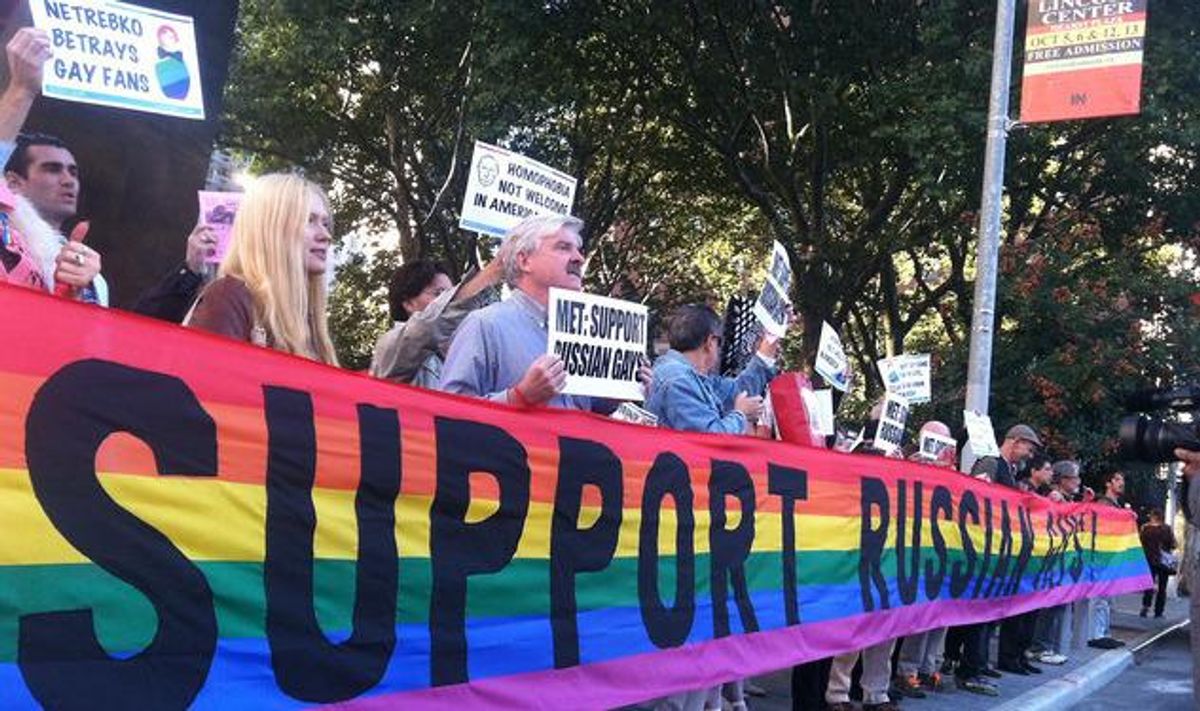 It was glitz, glamor, and gay rights at the Metropolitan Opera's opening night last night, when Valery Gergiev conducted all-star soprano Anna Netrebko in the beloved show Eugene Onegin. Even though the Russian government wants to pretend that Onegin scribe Pyotr Tchaikovsky was straight, that's obviously not the case, and LGBT activists here had asked Met General Manager Peter Geld to dedicate last night's performance to equality, a way of protesting Russia's anti-gay regime. The Met refused because, it said, "It is not appropriate for our performances to be used by us for political purposes, no matter how noble or right the cause." So, LGBT activists decided to stage their own showing outside, where they held banners, placards, and shirts declaring their love for inclusion, and urging the show's rich, famous attendees to join their cause: ending discrimination in Russia.