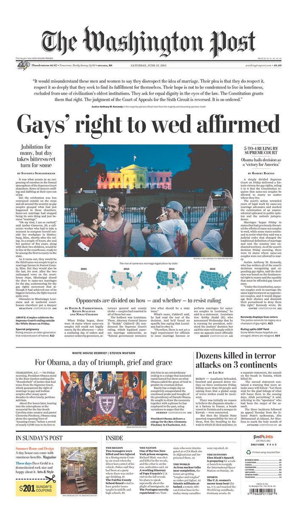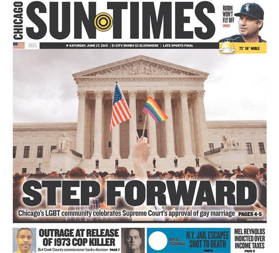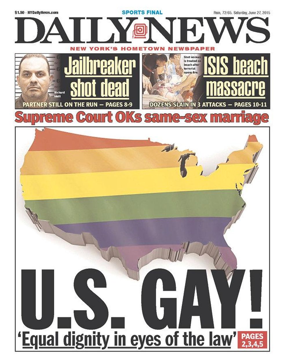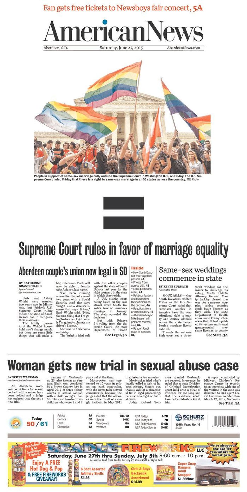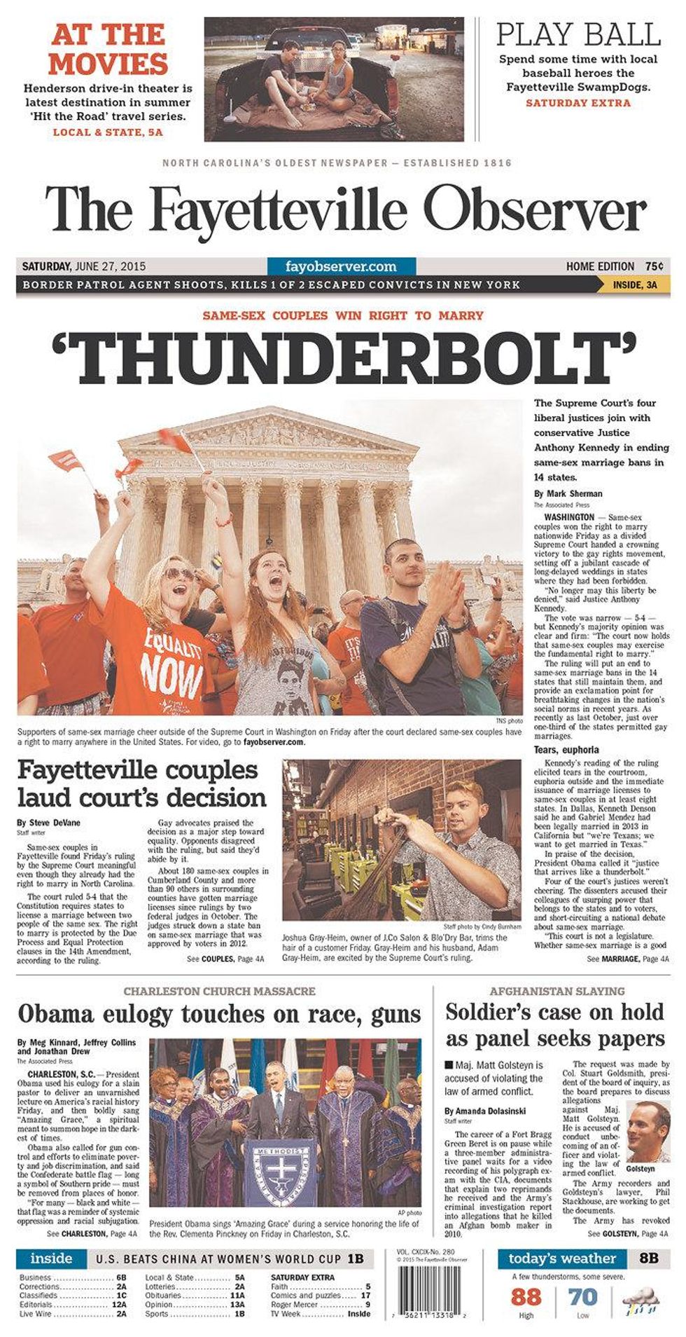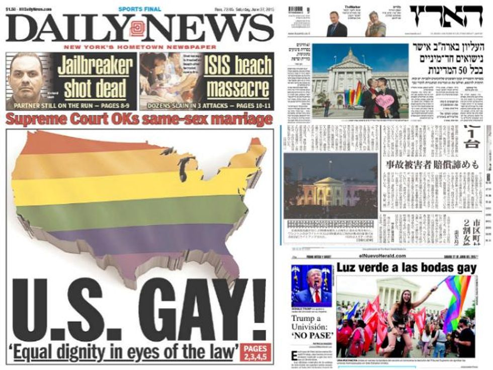 Exactly one week ago, at 10:02 AM, the United States Supreme Court declared once and for all that same-sex couples have a constitutional right to marry. Over the coming months, the effect our legalization of marriage equality will have on the rest of the world will be learned, but immediate reactions from around the country can most readily be seen in the ways in which newspapers chose to cover the historic ruling.