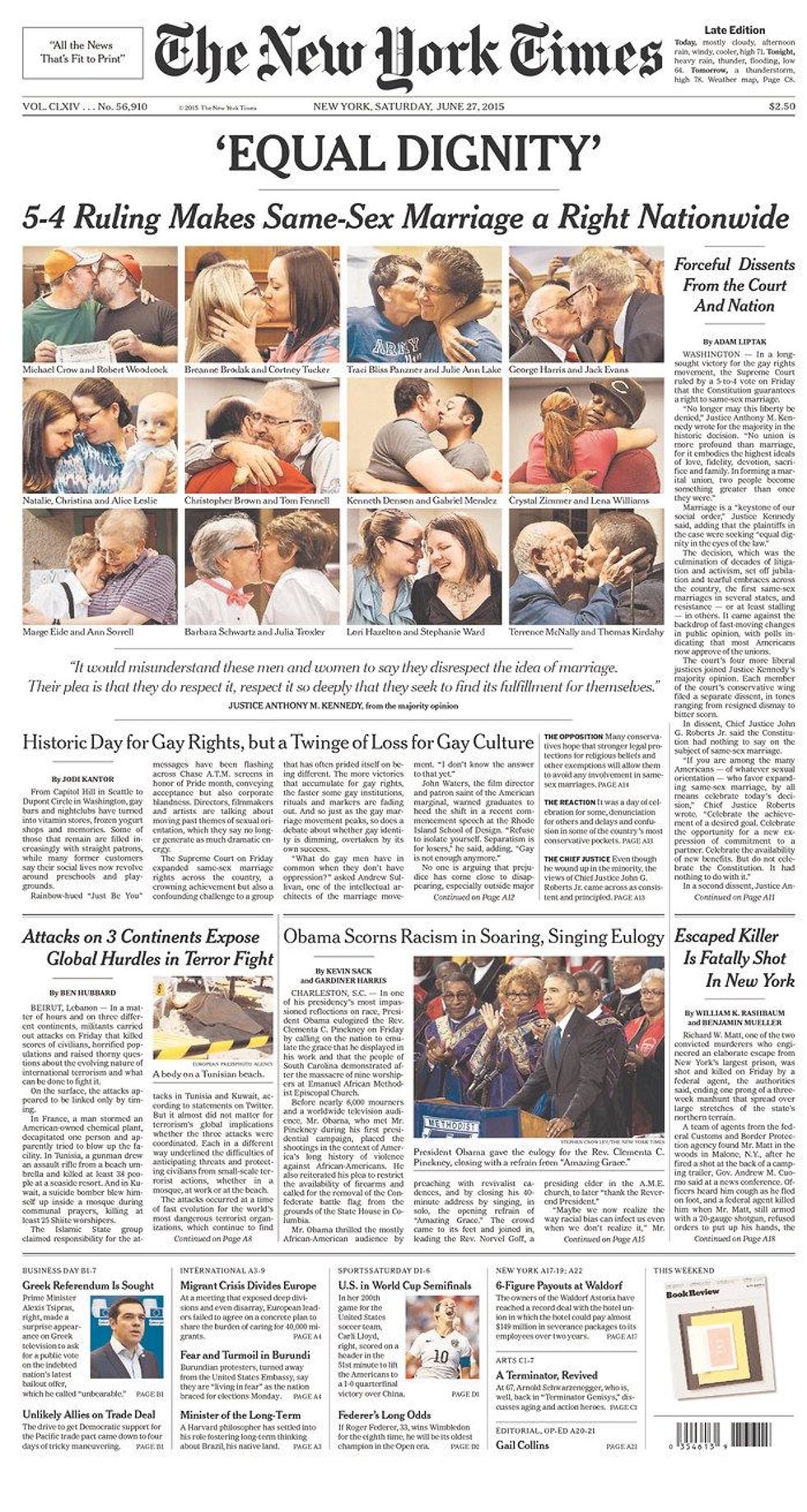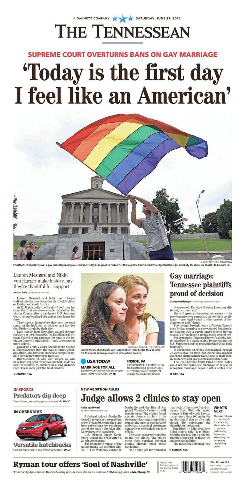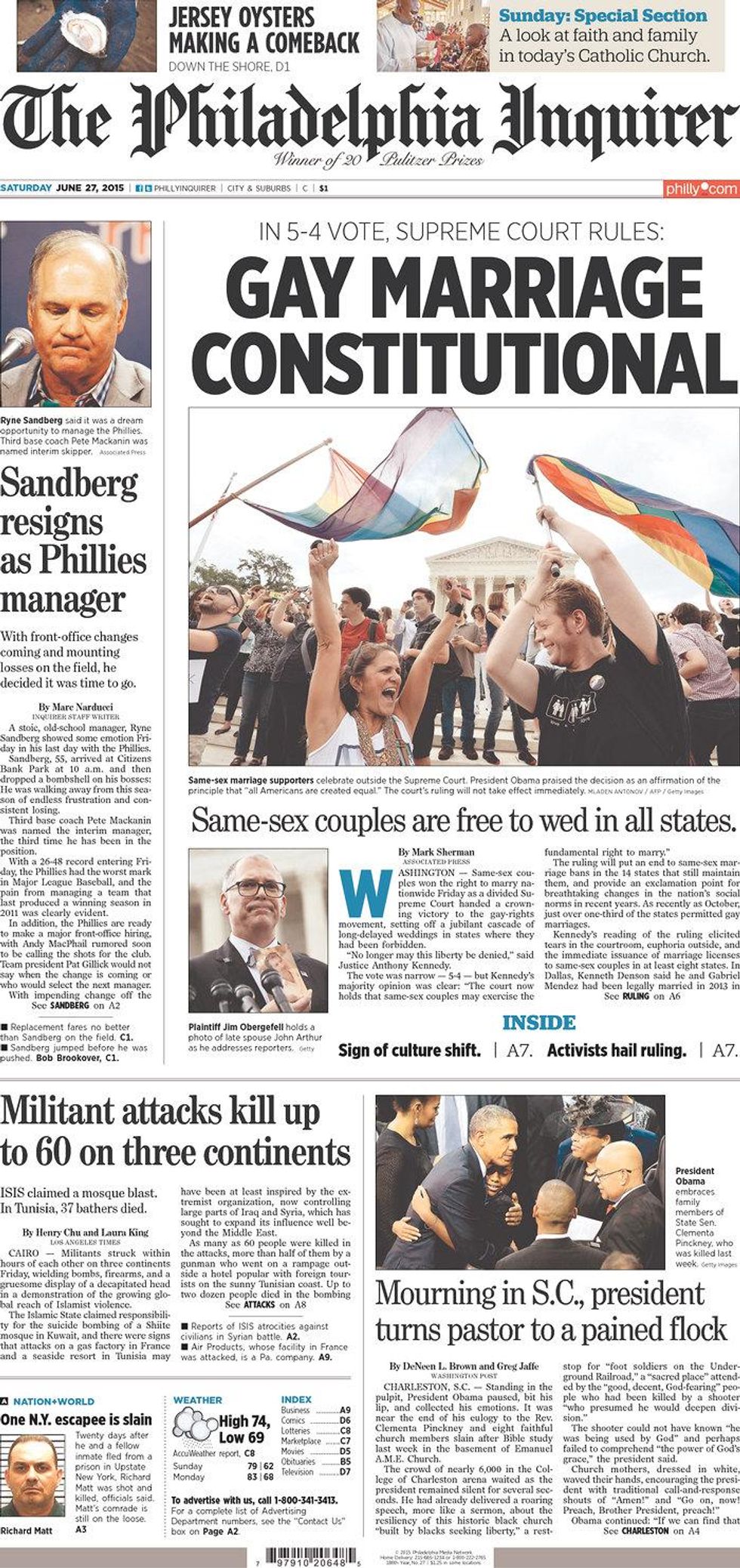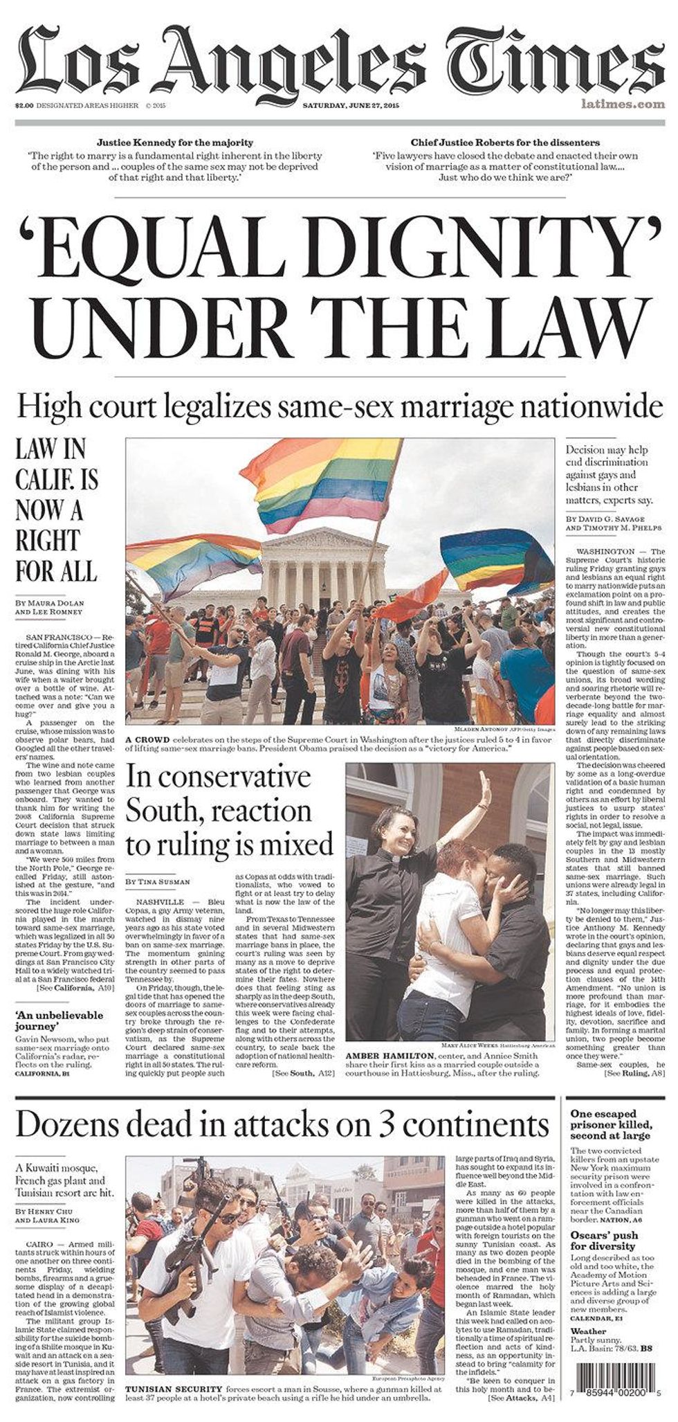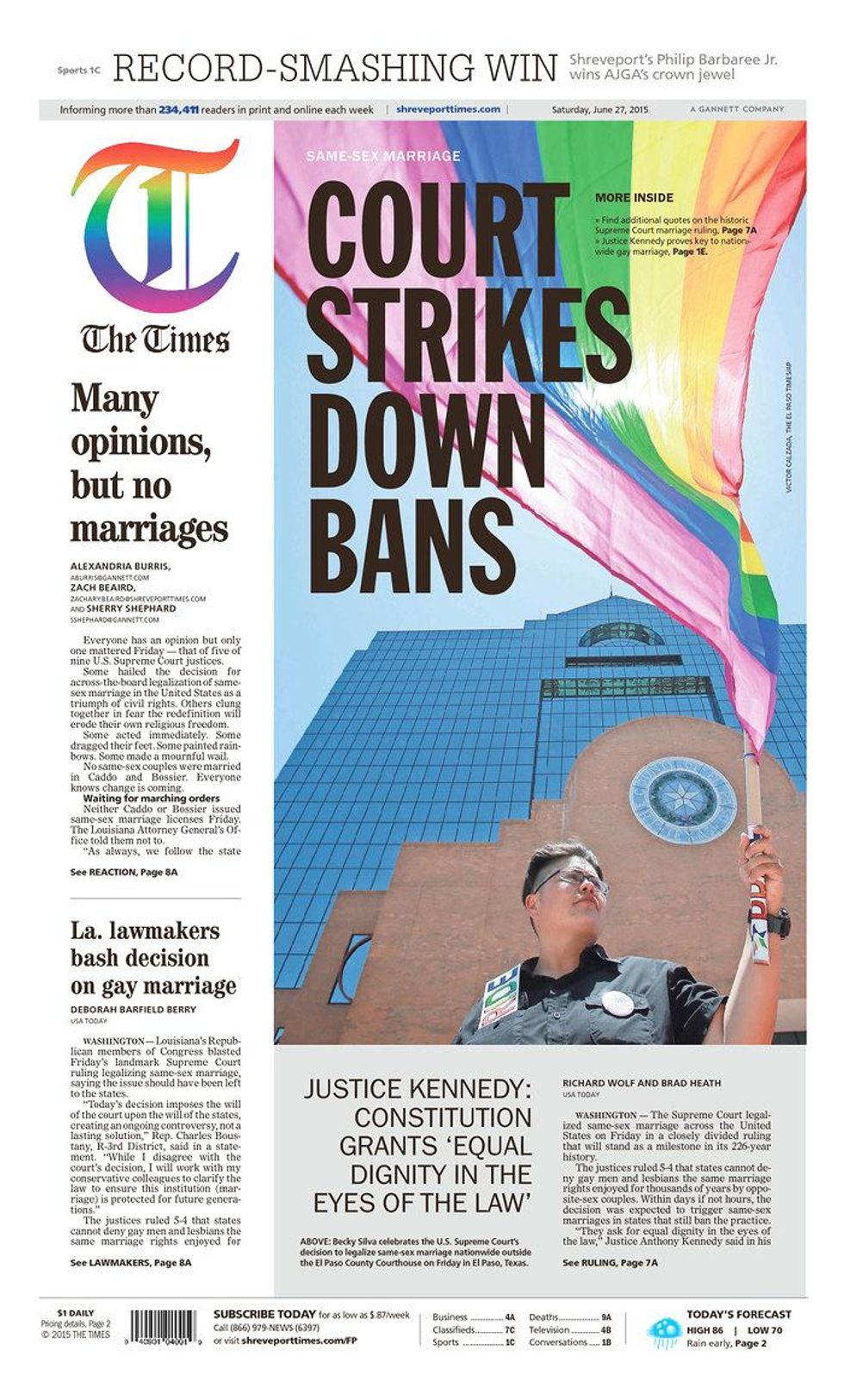 Exactly one week ago, at 10:02 AM, the United States Supreme Court declared once and for all that same-sex couples have a constitutional right to marry. Over the coming months, the effect our legalization of marriage equality will have on the rest of the world will be learned, but immediate reactions from around the country can most readily be seen in the ways in which newspapers chose to cover the historic ruling.