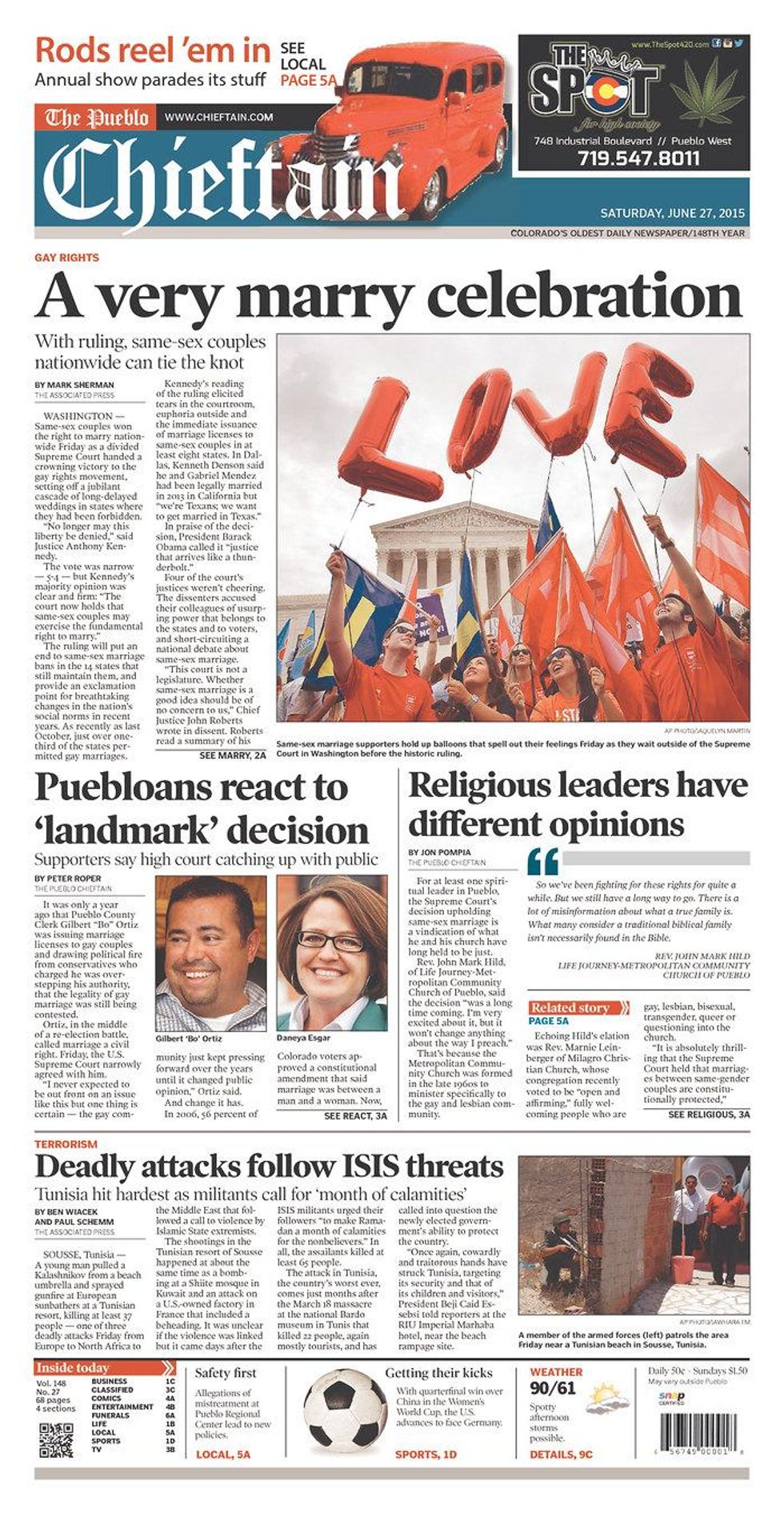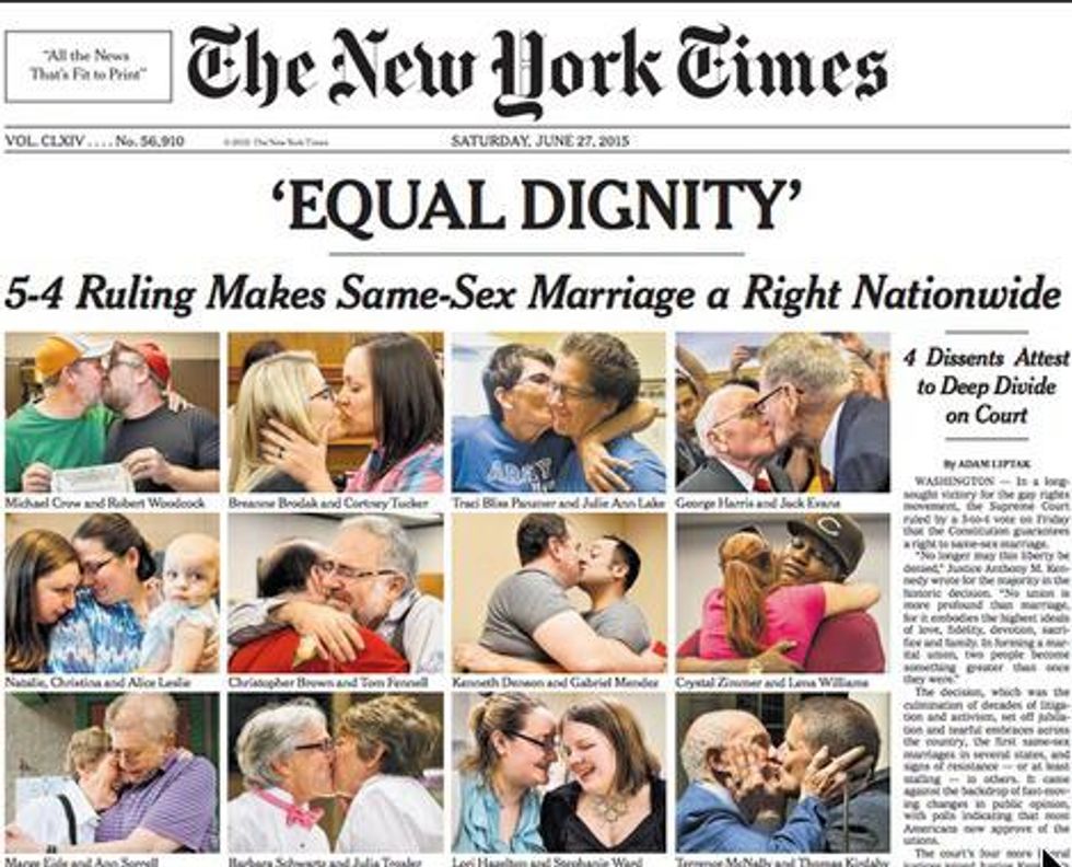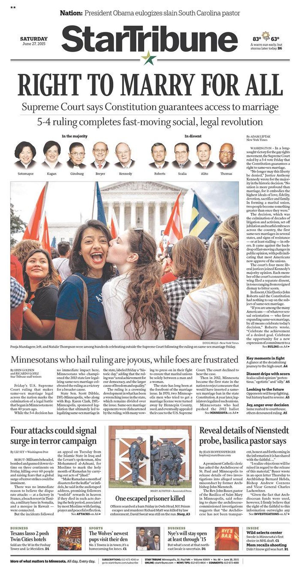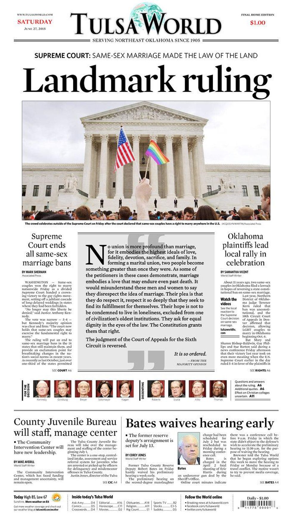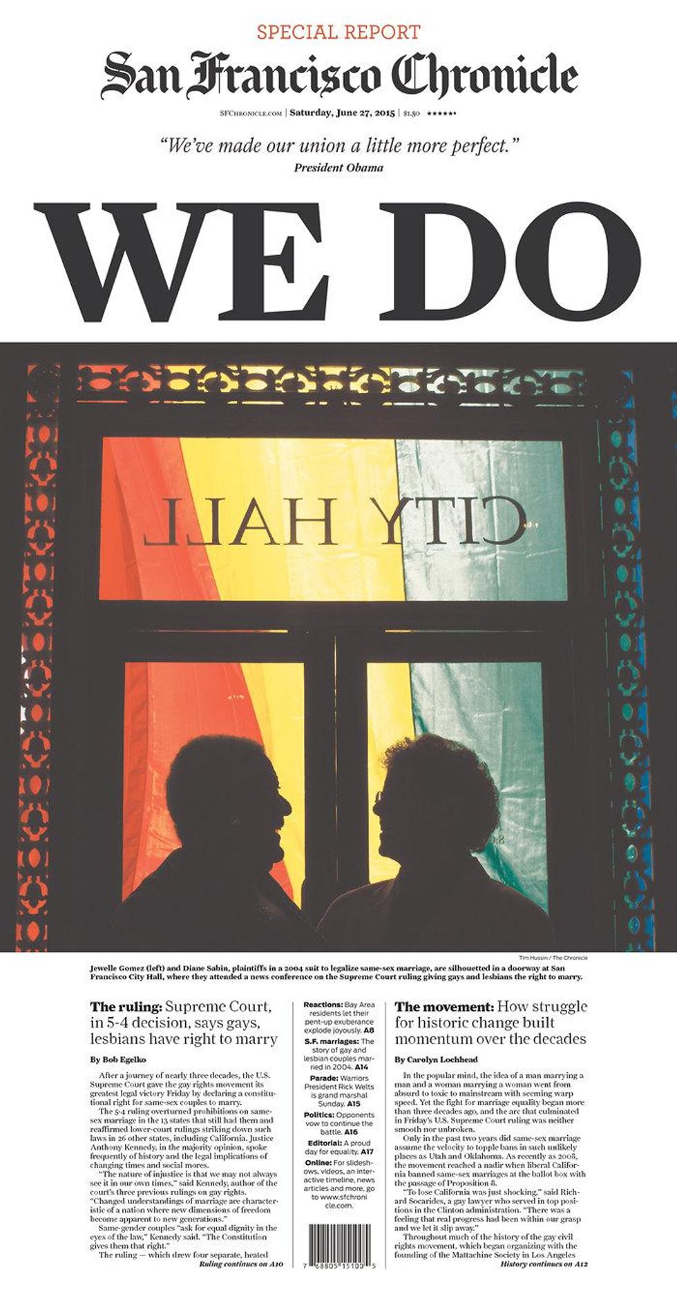 Exactly one week ago, at 10:02 AM, the United States Supreme Court declared once and for all that same-sex couples have a constitutional right to marry. Over the coming months, the effect our legalization of marriage equality will have on the rest of the world will be learned, but immediate reactions from around the country can most readily be seen in the ways in which newspapers chose to cover the historic ruling.