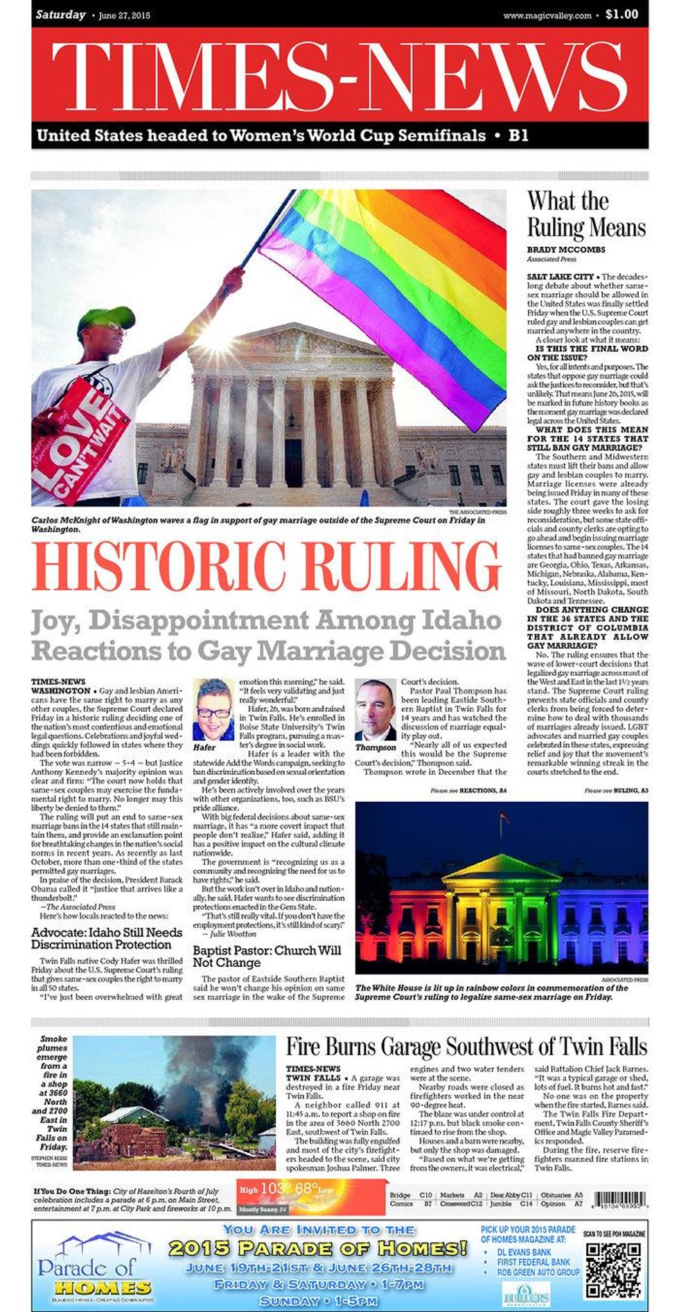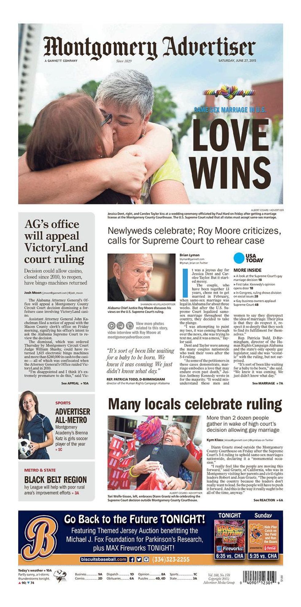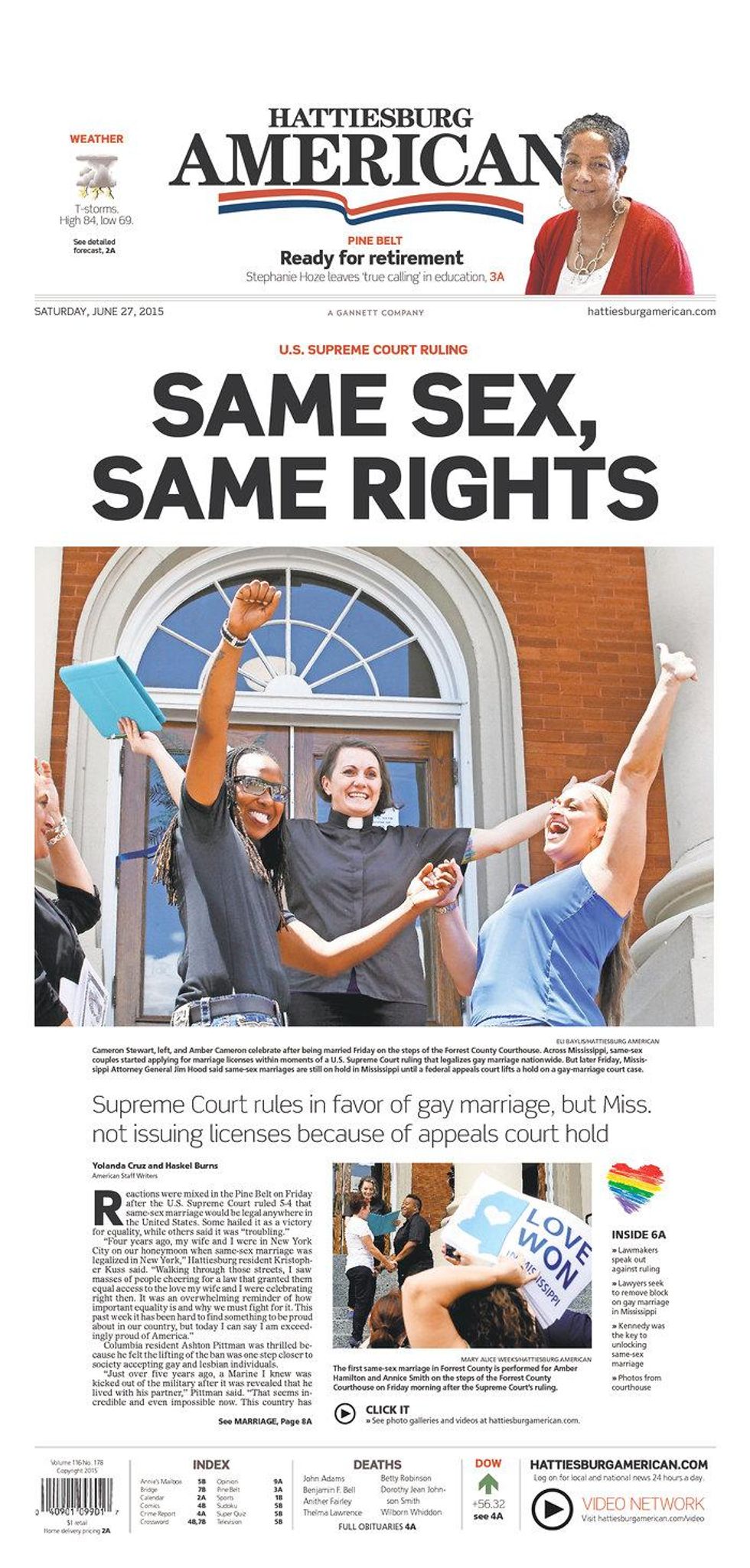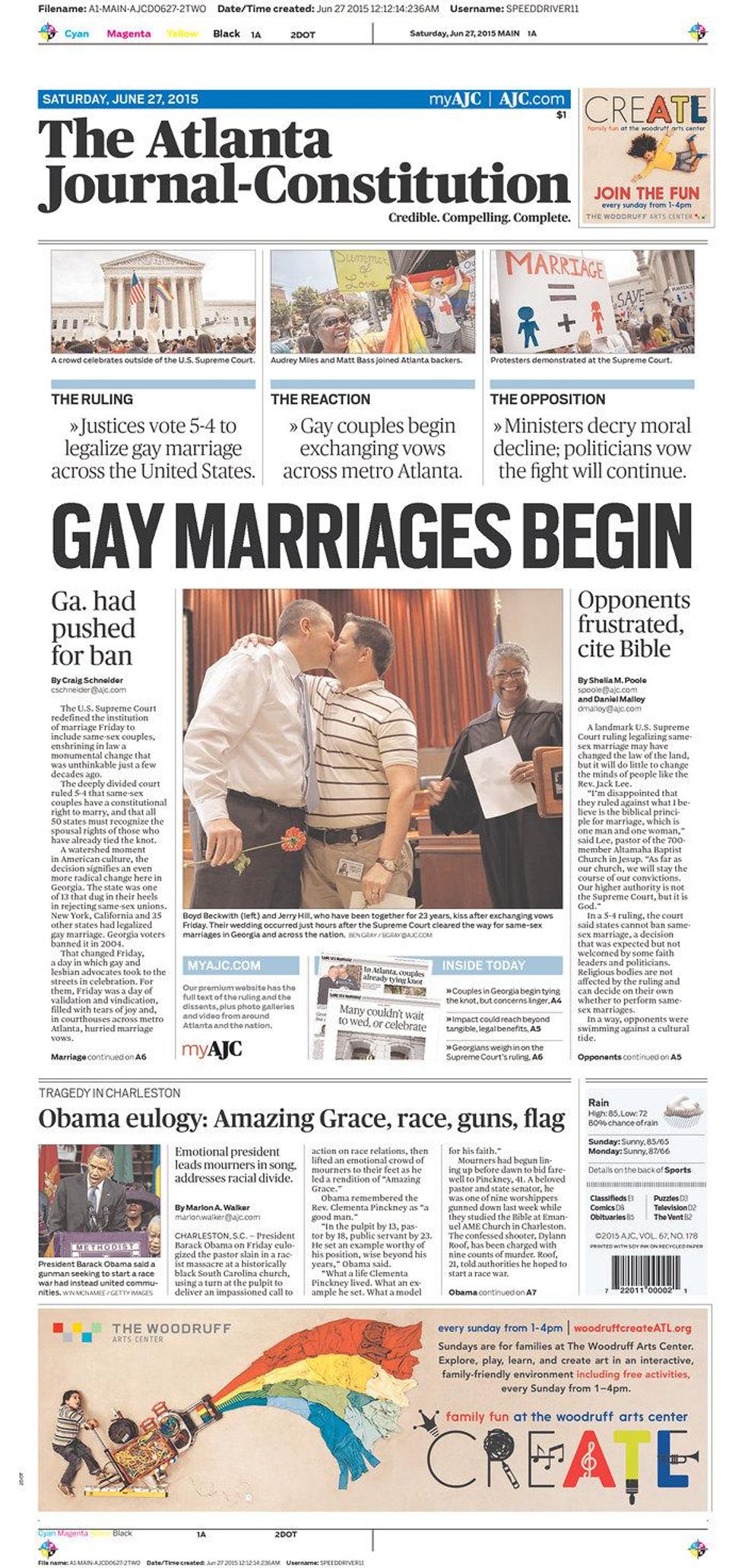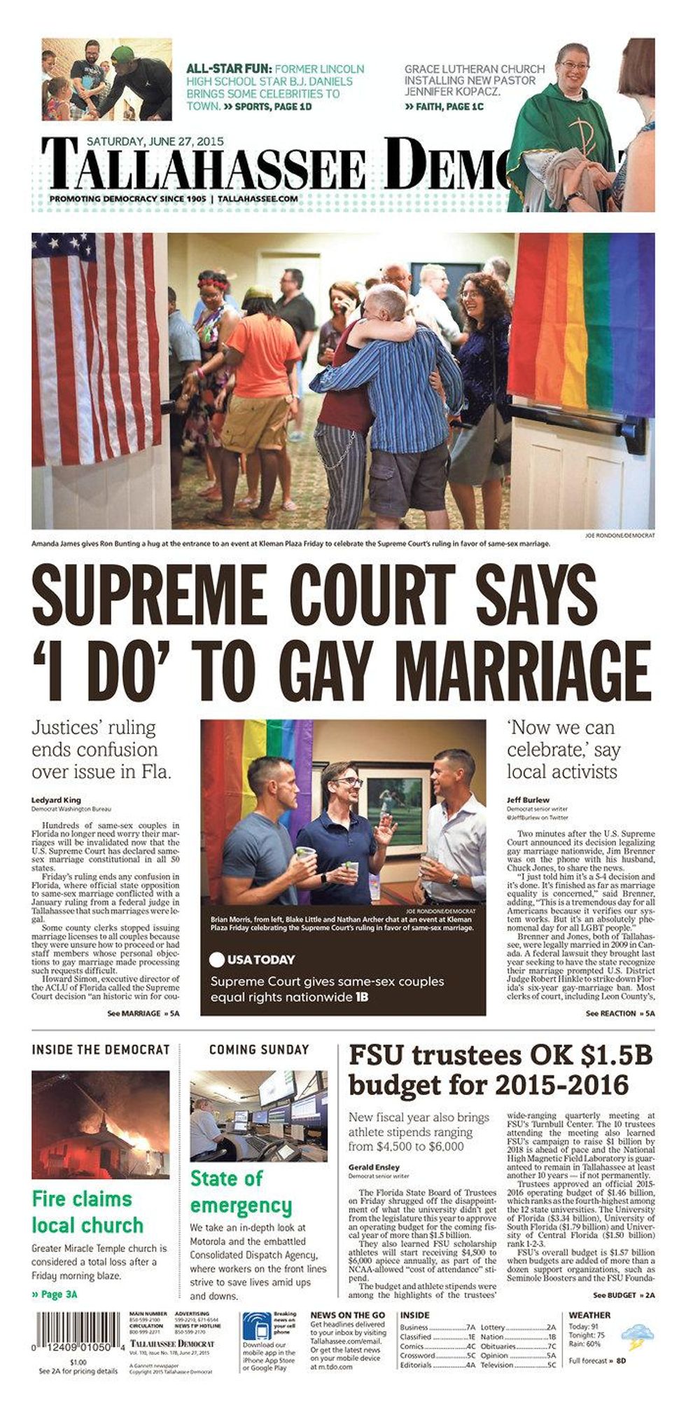 Exactly one week ago, at 10:02 AM, the United States Supreme Court declared once and for all that same-sex couples have a constitutional right to marry. Over the coming months, the effect our legalization of marriage equality will have on the rest of the world will be learned, but immediate reactions from around the country can most readily be seen in the ways in which newspapers chose to cover the historic ruling.