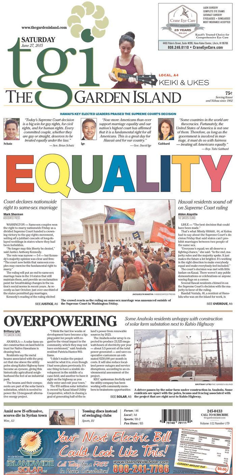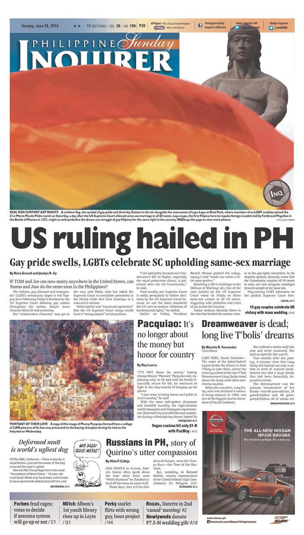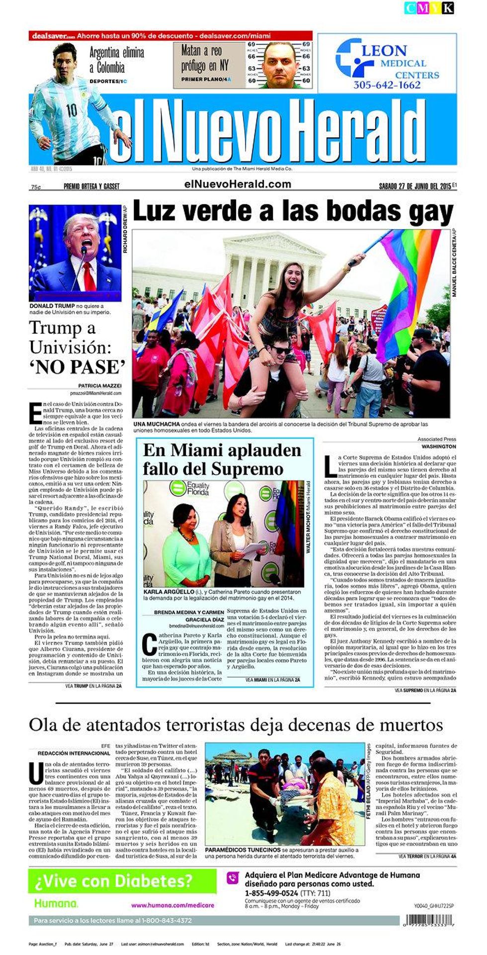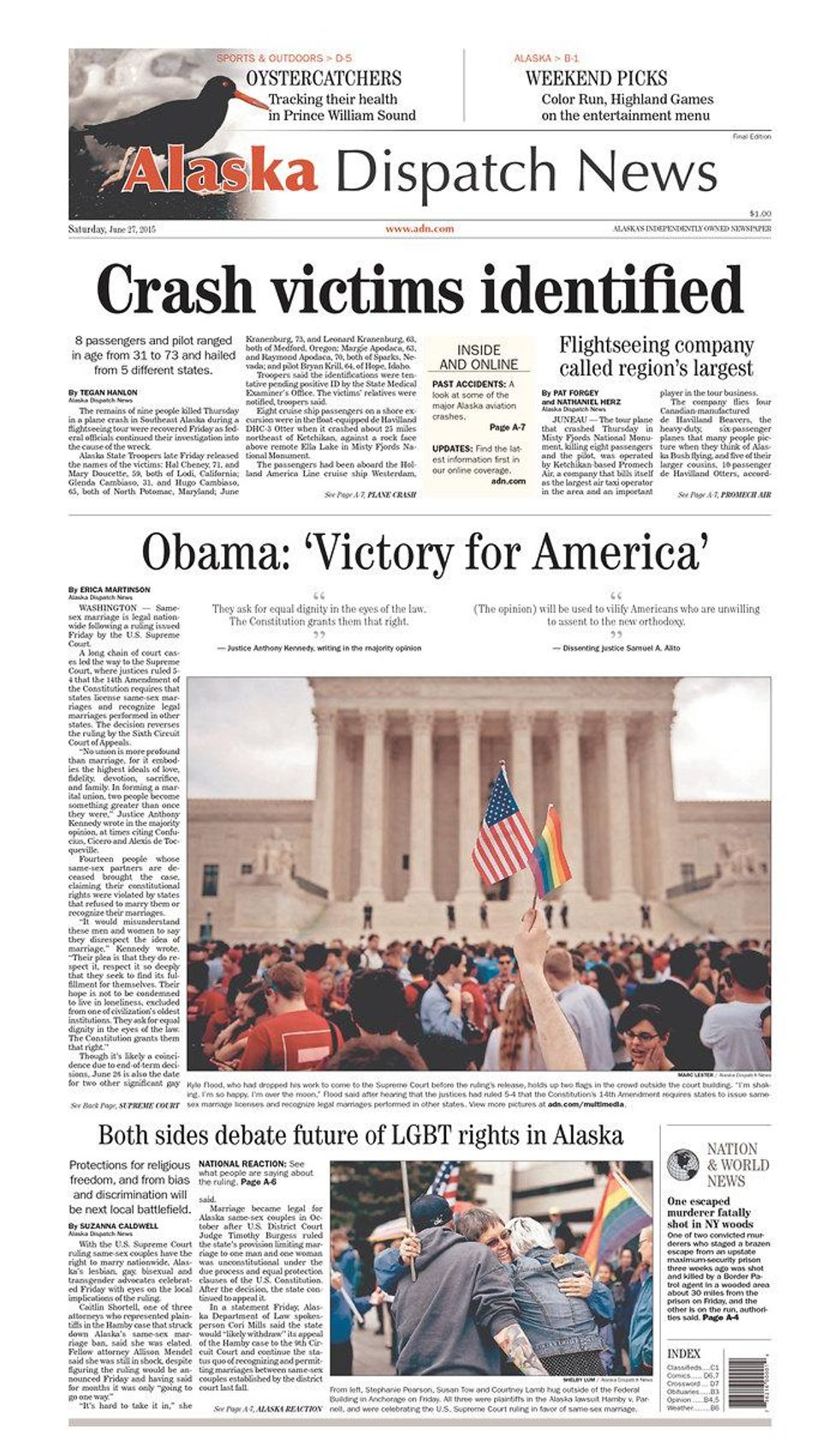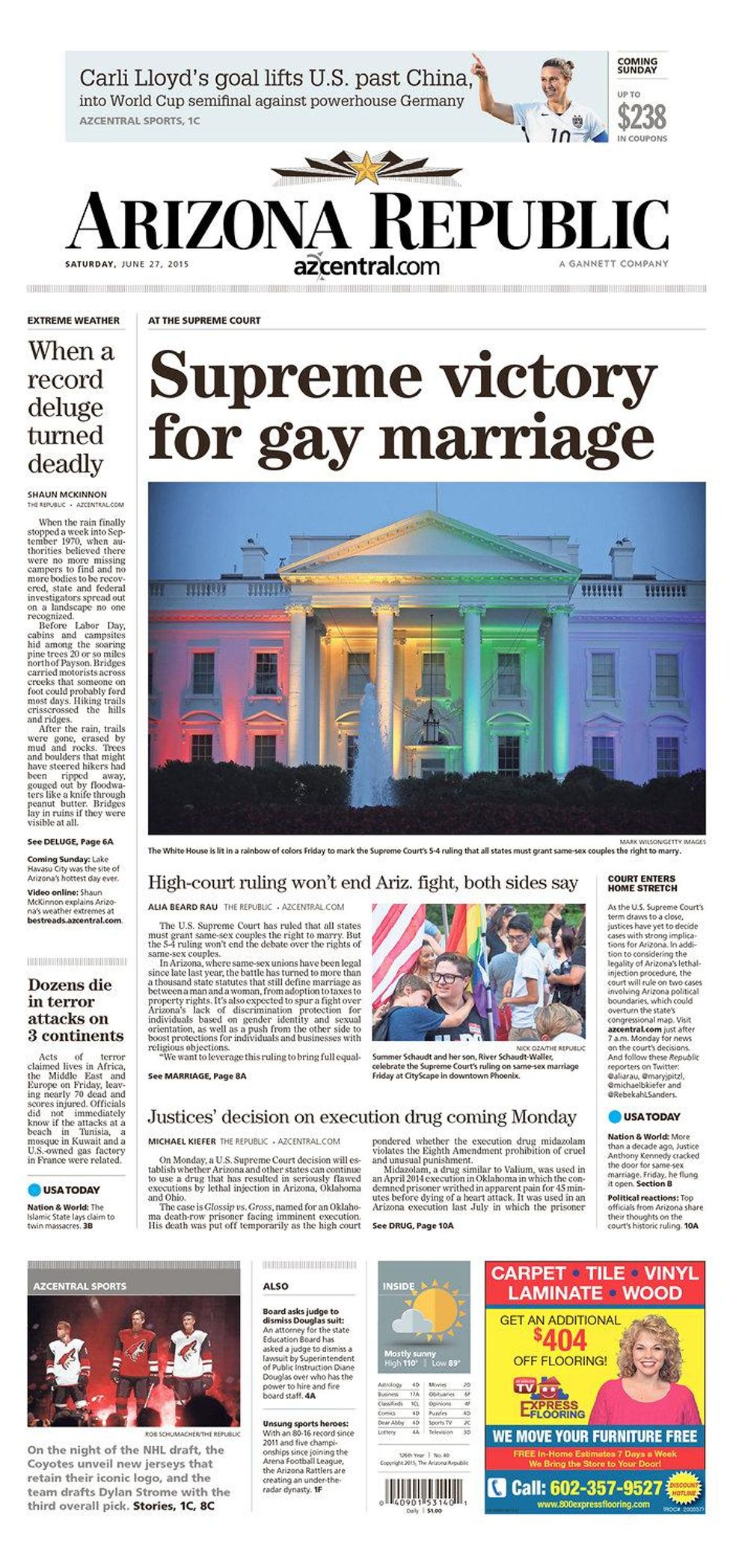 Exactly one week ago, at 10:02 AM, the United States Supreme Court declared once and for all that same-sex couples have a constitutional right to marry. Over the coming months, the effect our legalization of marriage equality will have on the rest of the world will be learned, but immediate reactions from around the country can most readily be seen in the ways in which newspapers chose to cover the historic ruling.