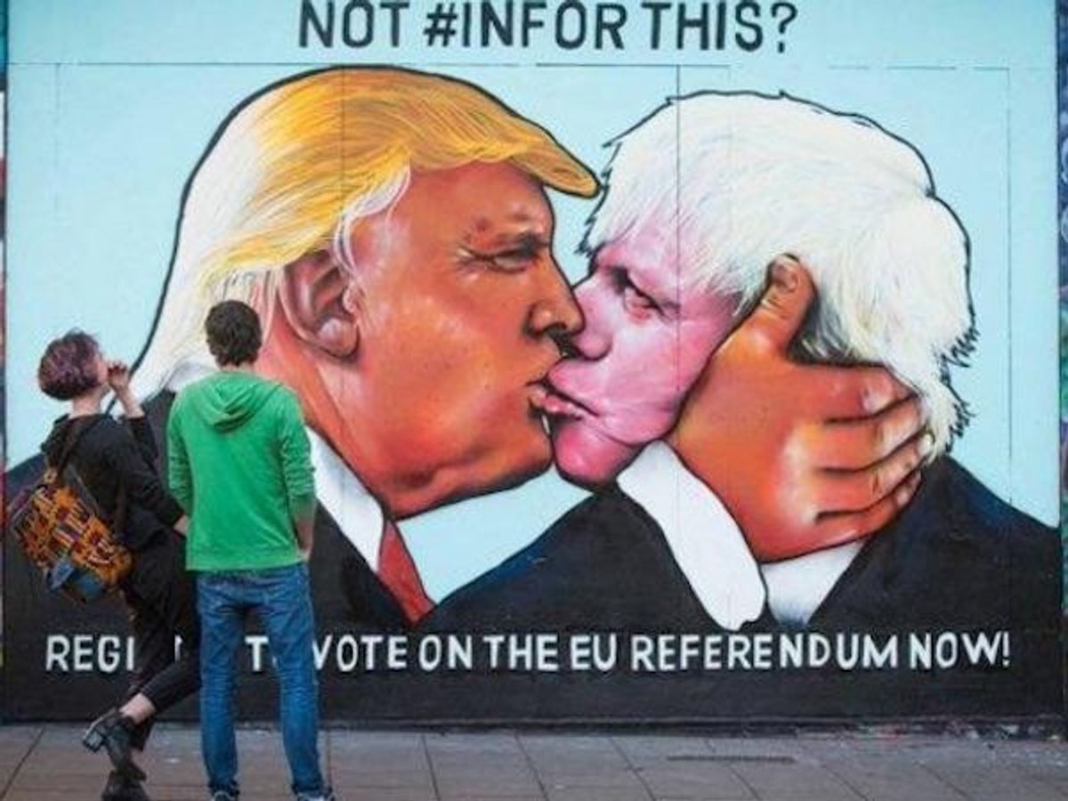 In Bristol, UK, a mural has been created that shows Donald Trump swapping spit with London's former mayor Boris Johnson. Painted by a group of politically active artists and thinkers called We Are Europe, the piece includes a caption reading: "Not #INFORTHIS? Register to vote on the EU Referendum now!"