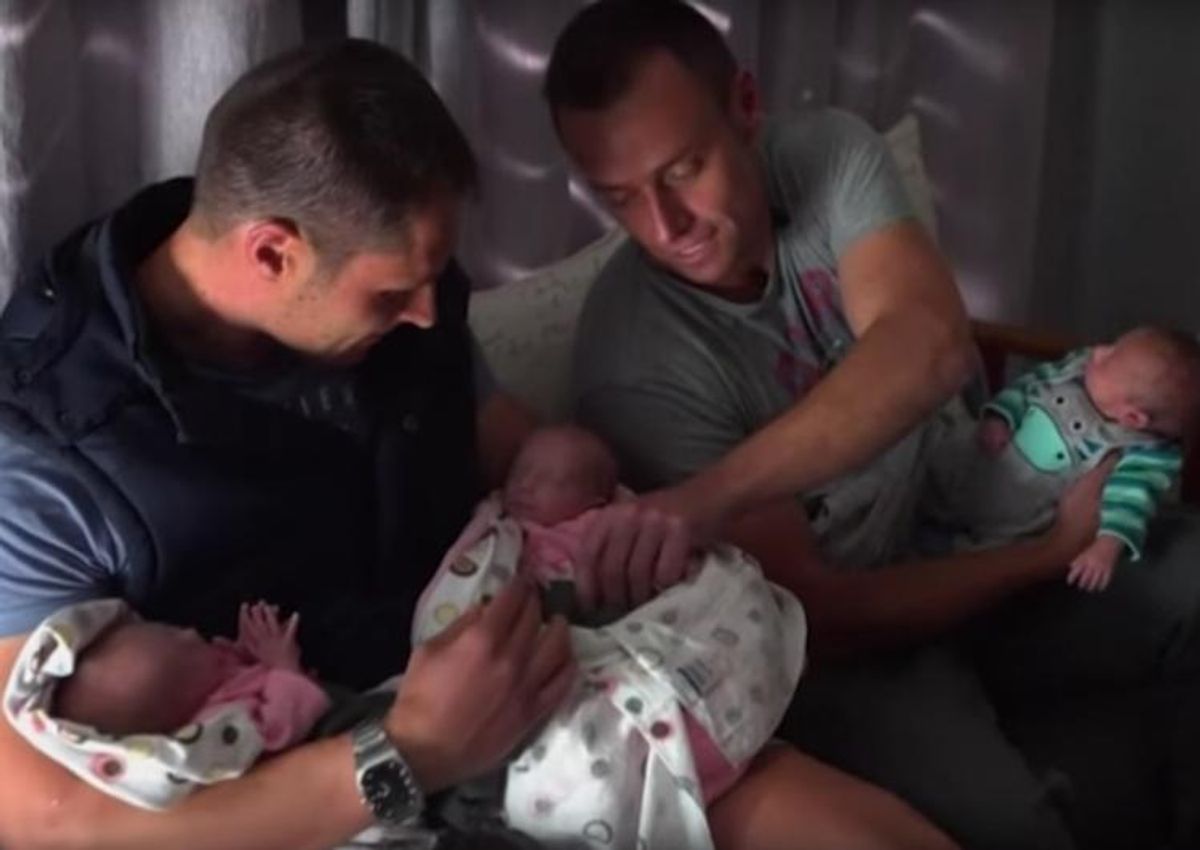 Christo and Theo Menalaou, a South African gay couple, just made medical history after both their DNA was used to have triplets. A surrogate mother carried the two eggs, one of which split in two and birthed the third child.