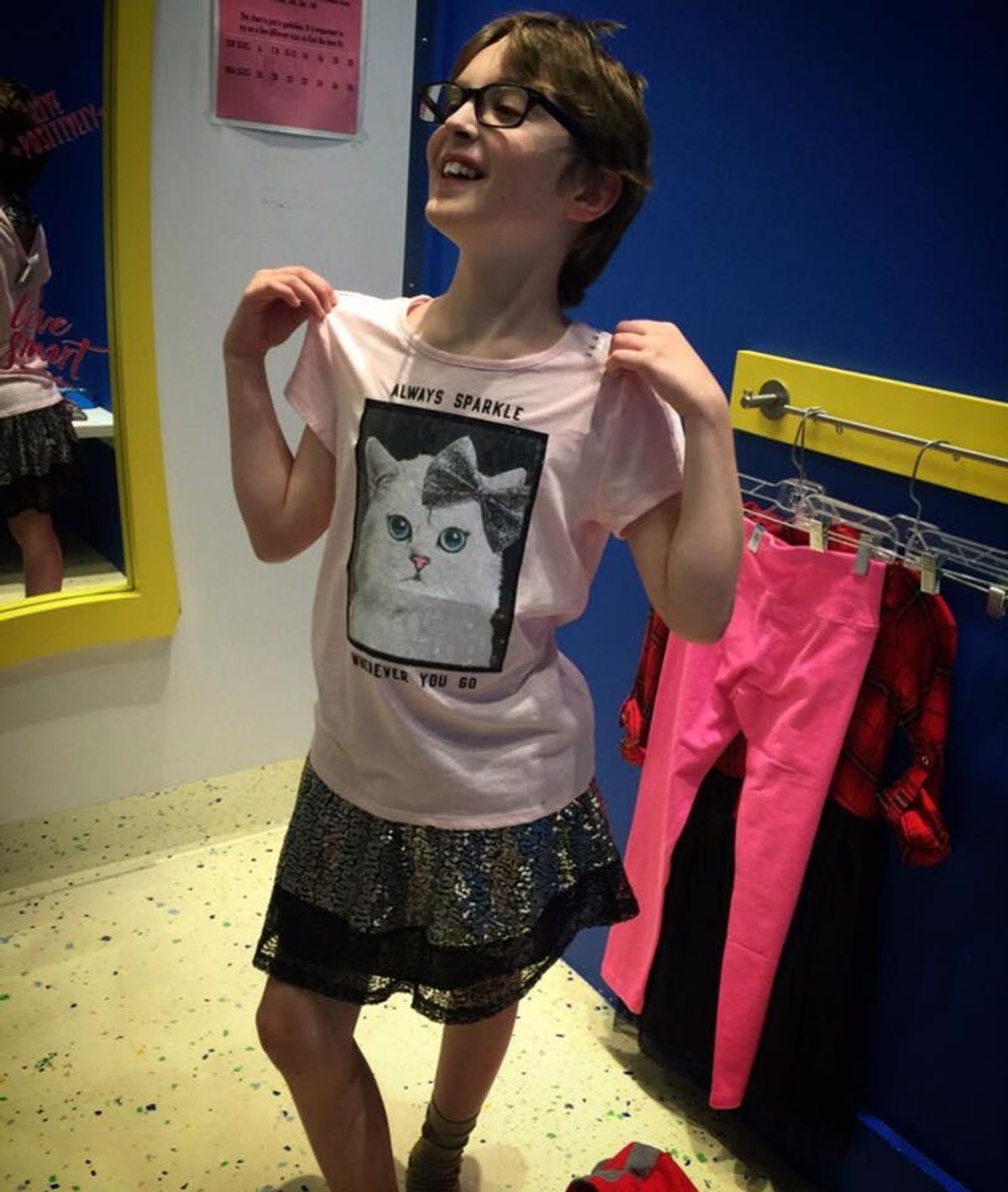 Sirois and her son live in Raleigh, North Carolina. After years of shopping for her unhappy son in the boys' section, and then weeks of research after the anti-trans House Bill 2 was passed, Sirois was finally ready to take her son shopping at Justice. Despite the transphobic legislature, they easily found allies in the staff at their local Justice store.
