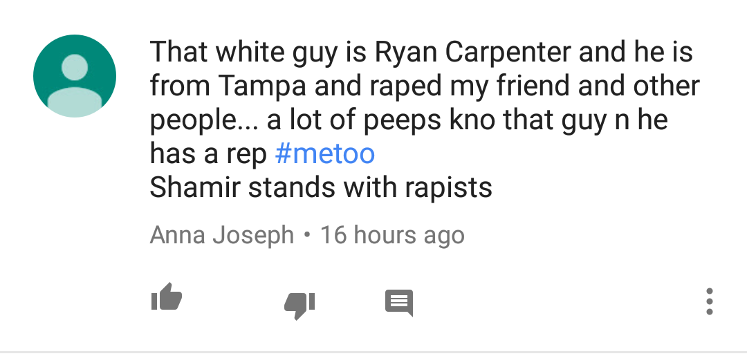 The actor/director mentioned is Ryan Carpenter, of Tampa, Florida, who Shamir met two years ago in Brooklyn. Speaking to OUT, Shamir explained that he was checking his YouTube comments last night when he stumbled on this one, accusing Carpenter of rape: