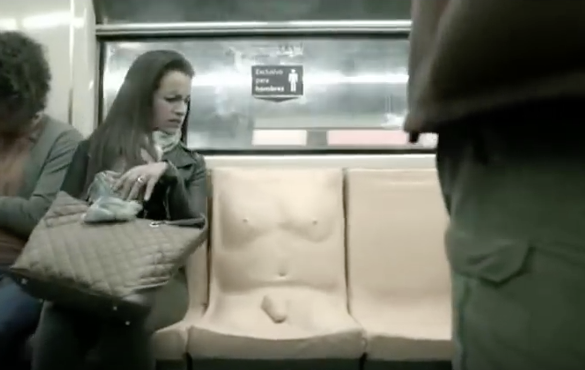 The seat, molded to look like a man's chest, belly button and crotch (with a flacid penis) has a sign above it reading, "It's uncomfortable to sit here, but it doesn't compare with the sexual violence that women suffer in their everyday lives. 9 out of 10 women in Mexico City have been victims of some form of sexual violence."