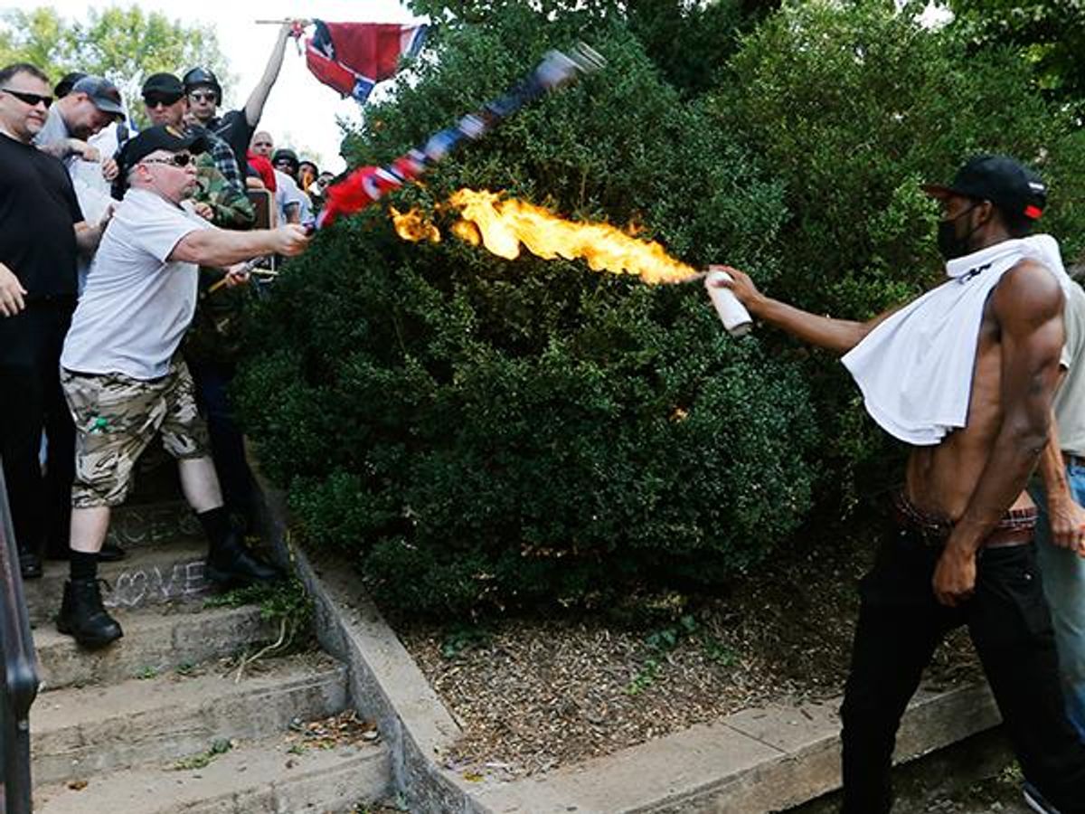 But in the meantime, we can't stand idly by and hope that tweeting #ThisIsNotUs is enough to make a difference. We have to literally fight this battle. White people need to be using their bodies to shield people of color on the frontlines of protests. We all need to be calling our representatives and pushing for harsher punishments for hate crimes. We need to be dismantling the police force that has been killing black men for decades yet did not lift a finger to stop the angry white nationalists with tiki torches who left three dead and 35 injured in Charlottesville. We need to be out there punching Nazis and white nationalists in the face. We can't dismantle bigotry, but we can dismantle bigots.
