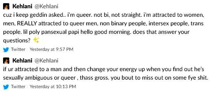 "Cuz i keep geddin asked.. i'm queer. Not bi, not straight. i'm attracted to women, men, REALLY attracted to queer men, non binary people, intersex people, trans people. lil poly pansexual papi hello good morning. does that answer your questions?" And continued: "if ur attracted to a man and then change your energy up when you find out he's sexually ambiguous or queer, thass gross. you bout to miss out on some fye shit."