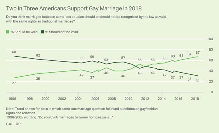 A recent poll found that Americans overall are more supportive of same-sex marriage than before, per Huffington Post. Gallup's annual Values and Morals poll found that 67 percent of Americans surveyed agreed that same-sex marriage should be legally valid. (This is up 40 percent from 1996 when Gallup first asked the question.)