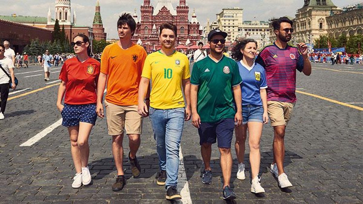 Marta Marquez, Eric Houter, Eloi Pierozan Junior, Guillermo Leon, Vanesa Paola Ferrario, and Mateo Fernandez Gomez (from Spain, the Netherlands, Brazil, Mexico, Argentina, and Colombia respectively) took a bold risk making a statement against Russia's homophobic laws while the country hosts the World Cup. They walked together in Russia, creating their own rainbow out of soccer jerseys.