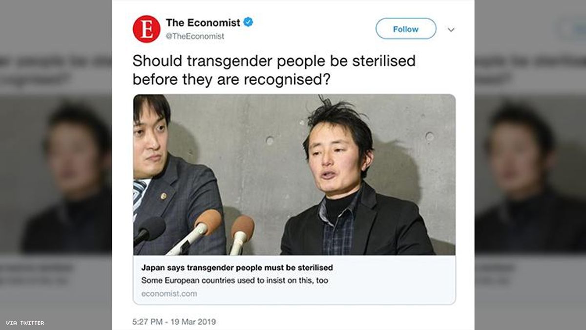 The British publication's Twitter account posted a tweet Tuesday evening that read, "Should transgender people be sterilized before they are recognized?", which linked to a week-old article about Japan's Supreme Court ruling that trans people in the country must undergo sex reassignment surgery before legally changing genders.