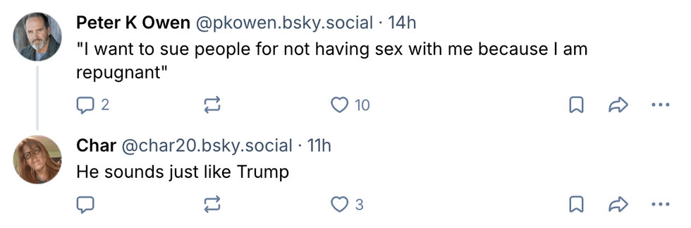 Steve Jones (@fernieboy.bsky.social)The user whose name was removed by Jones insists they probably have enough for a class-action lawsuit based on people posting personal ads where they make it clear they’re not interested in dating Trump supporters.