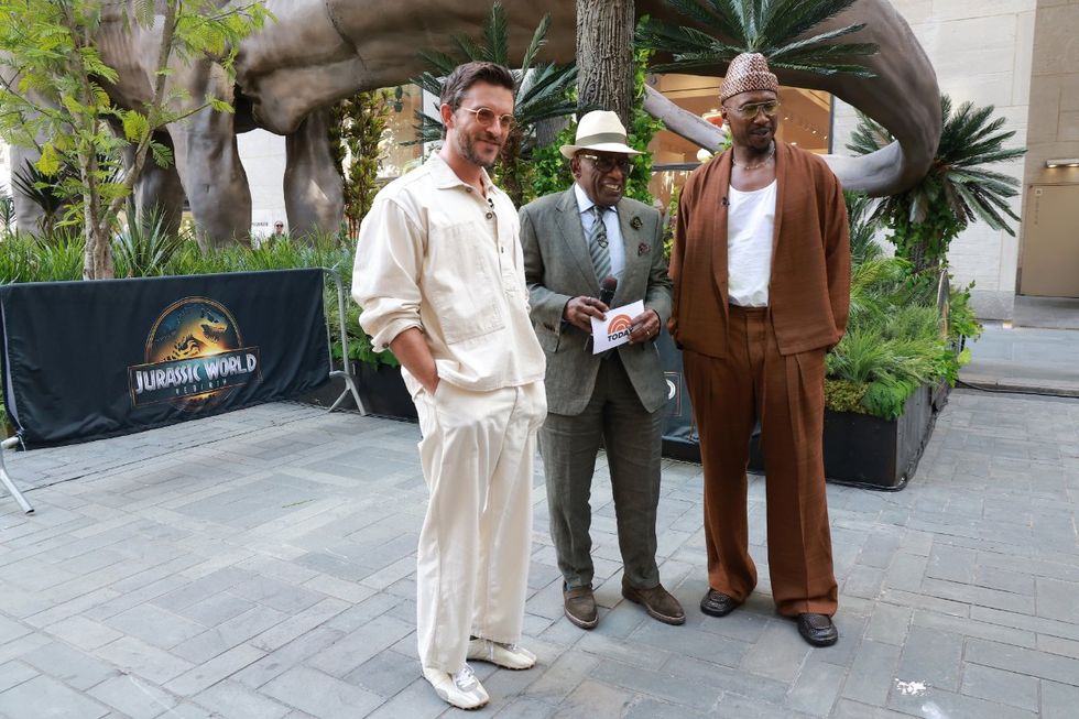 NEW YORK, NEW YORK - JUNE 24: (L-R) Jonathan Bailey, Al Roker and Mahershala Ali attend a Universal Pictures and Amblin Entertainment special cast appearance for JURASSIC WORLD REBIRTH in New York on Tuesday, June 24. 2025 in New York City.