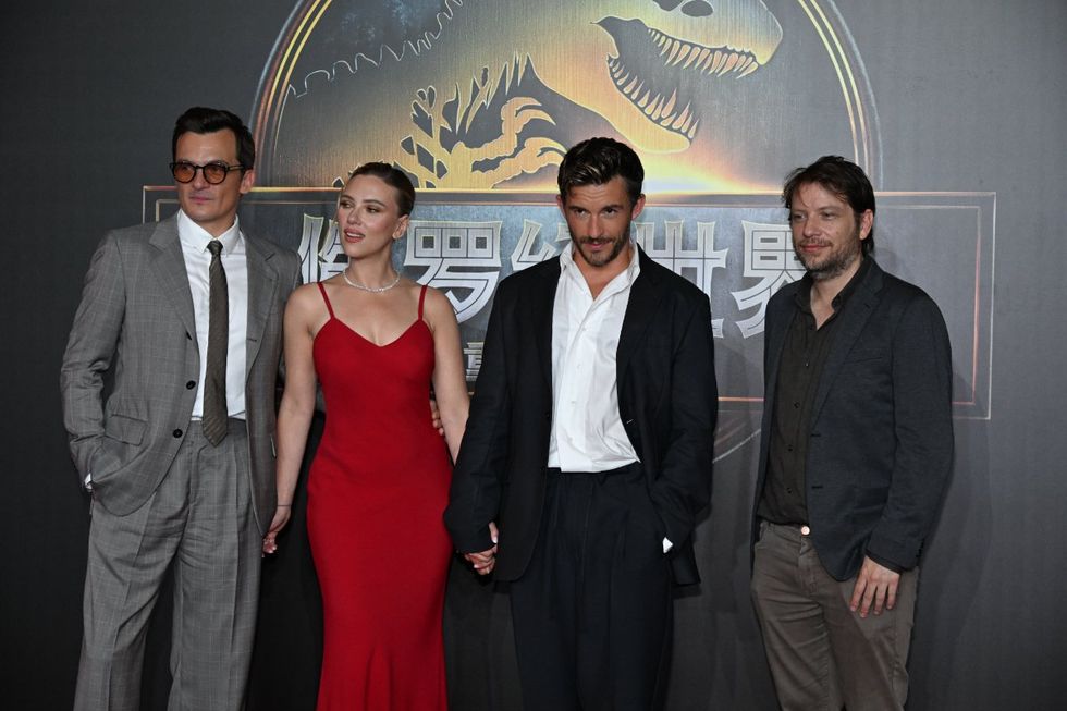 SHANGHAI, CHINA - JUNE 29: (L-R) English actor Rupert Friend, American actress and singer Scarlett Johansson, English actor Jonathan Bailey and British filmmaker and director Gareth Edwards attend the premiere of 'Jurassic World Rebirth' on June 29, 2025 in Shanghai, China.