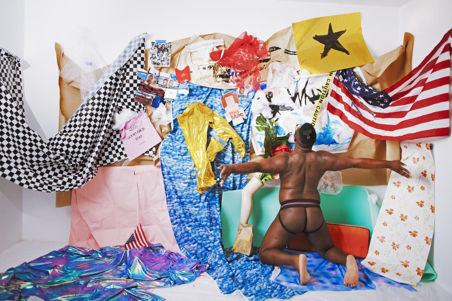 On display through September 30, 'whew chile, the ghetto!' brings the ghetto to the gallery thanks to a series of stunning self-portraits featuring Cunningham starkly posed against his DIY backdrops of carefully curated found objects. "Someone told me that your life is the sum total of all of your experiences up to that moment," he explained over the phone from Los Angeles. "So, with the sets and photographs, I was implementing that concept." Wrinkled American flags, McDonald's burger boxes, anime characters from Yu-Gi-Oh and Naruto, and backdrops fit for high school photo day meld together in a Where's Waldo of moments from Cunningham's queer youth.