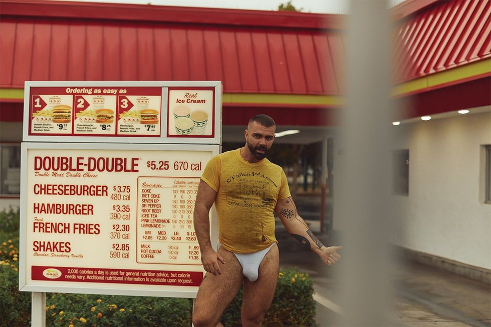 To illustrate the power of this print photography to capture Cali’s queer soul, Strachan points to the back cover image of models Chris Damned and Andrew Forrest “running into the Malibu surf naked, which just makes me want to throw down my phone and do just that. And then there’s Enrique Agudo at In-N-Out Burger; I defy you to show me a better-worn jockstrap.”