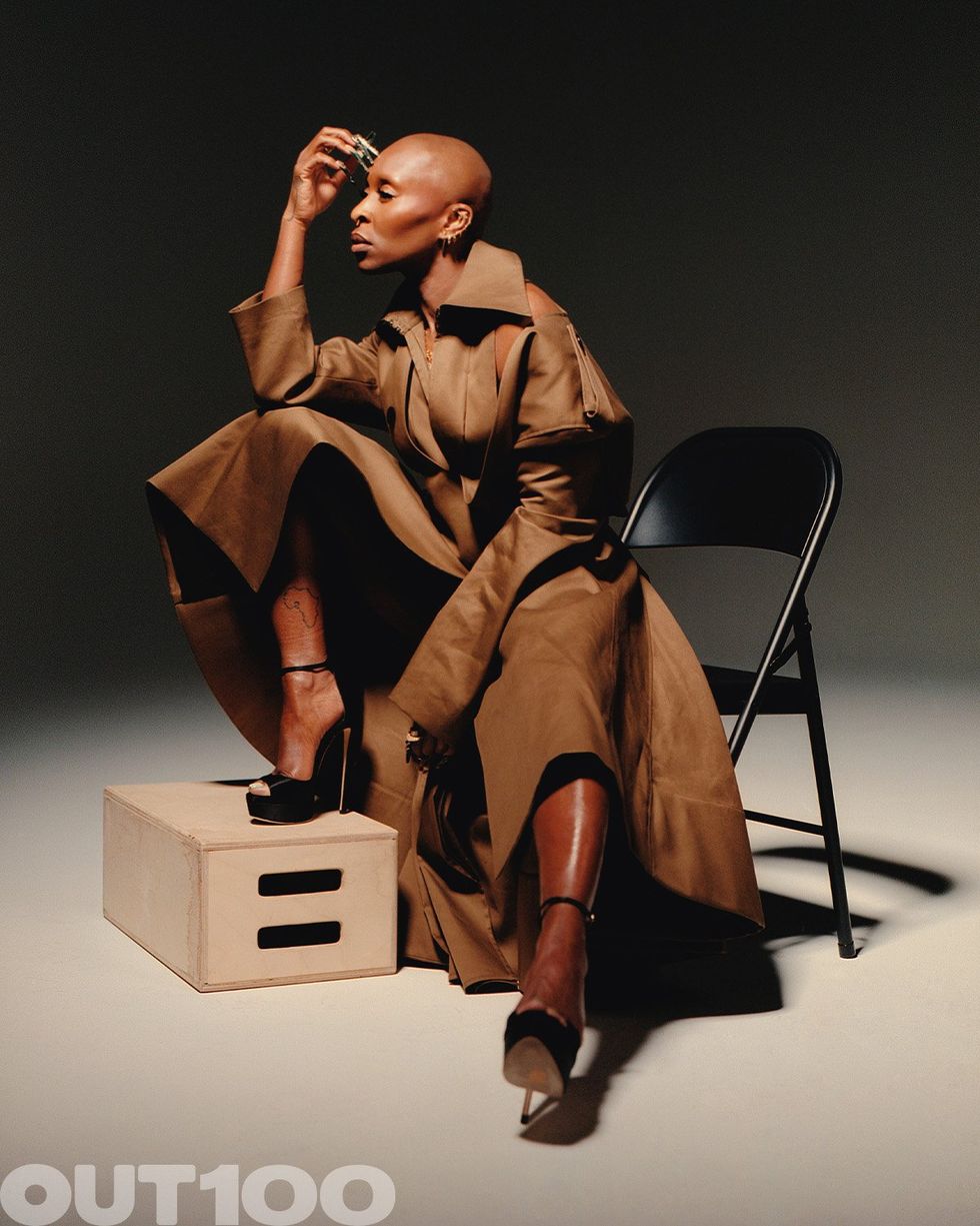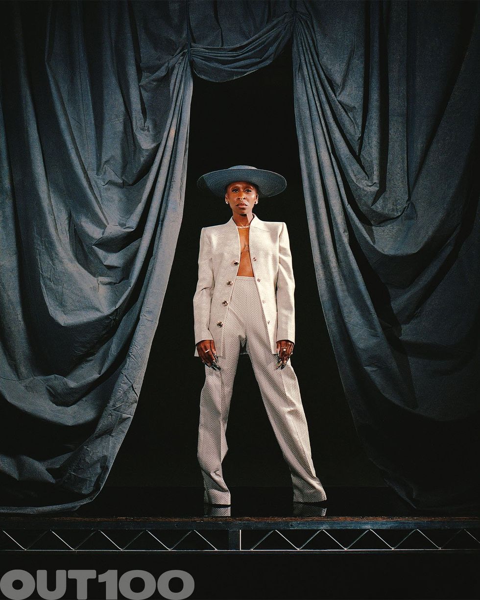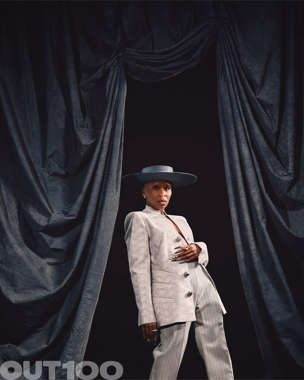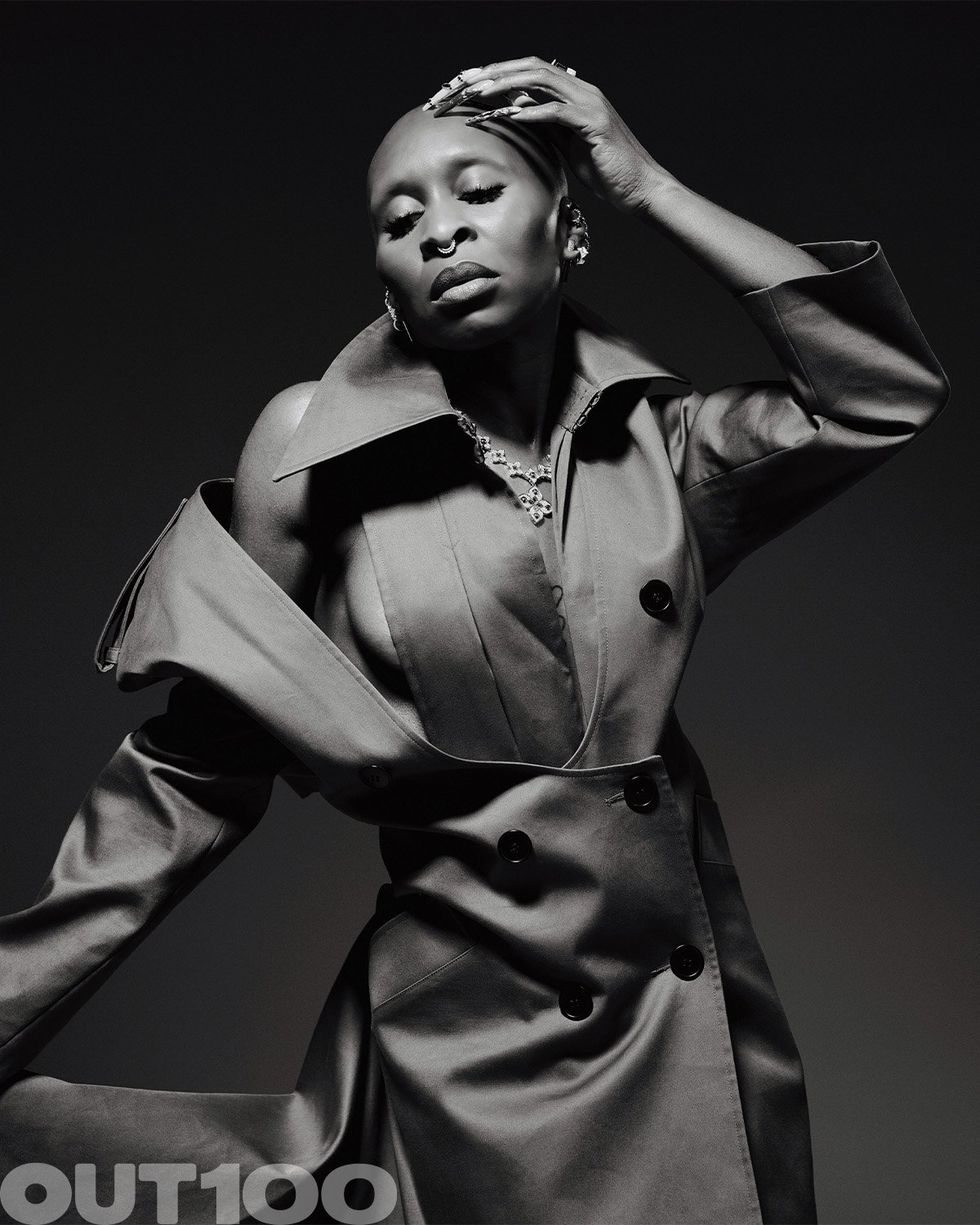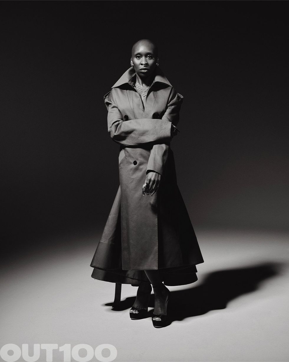 More than 60 years later, Emmy, Grammy, and Tony winner Cynthia Erivo poses for her Out cover shoot in Los Angeles just three months from the release of the wildly anticipated big-screen adaptation of the musical Wicked, in which she stars as the misunderstood, viridescent Elphaba. She balances a cigarette between her fingers. In other pictures, she leans into her physical prowess, performing a headstand or standing on one leg. Throughout, she holds the Another Country author and A Raisin in the Sun playwright close at heart.