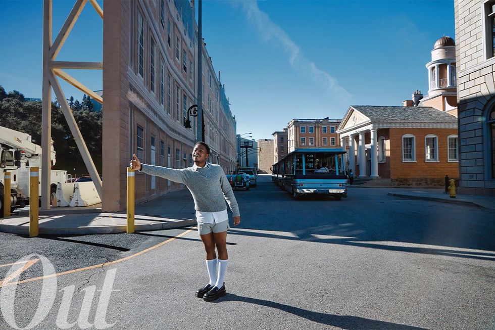 This interview is part of Out's March/April fashion spread, in which out actors Joel Kim Booster, Daniel Kyri, Mark Indelicato, and Satya Bhabha talked TV and modeled menswear on the Universal Studios Lot’s Courthouse Square.
