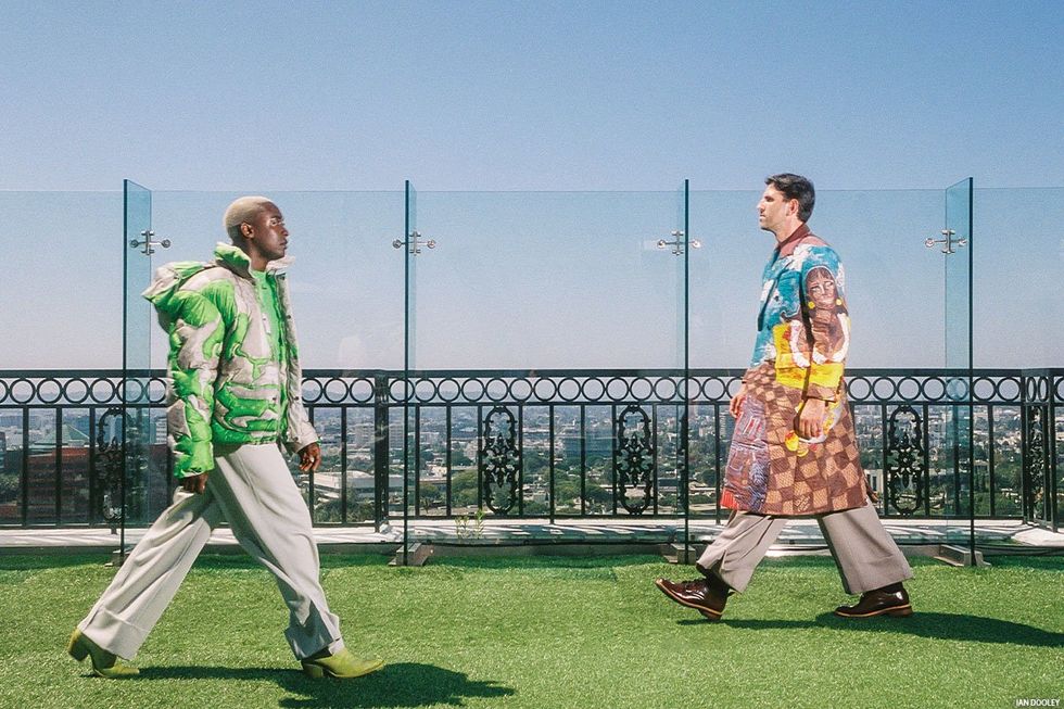 Vincint (left) - LOUIS VUITTON Coat, Sweater, and Pants; PSKAUFMAN Shoes // Fabian (right) - LOUIS VUITTON Coat and Pants; PSKAUFMAN Shoes