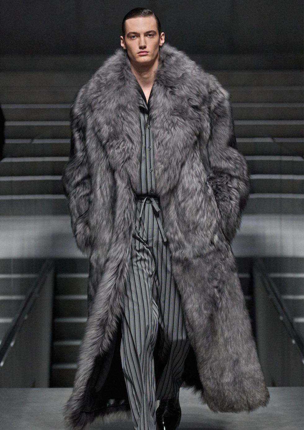 Although a common staple in many a gay man’s wardrobe (through different variations), the world of feathers, fringe, and fur has hit the menswear mainstream in full force this season. Louis Vuitton took Paris on a wild western ride, showcasing leather chaps and wool coats with fringe detailing as well as luxurious multicolor furs (echoing the Mob Wife Winter trend currently in action). Gucci sent down an overcoat that imitated the look of fringe, but in actuality, the effect was accomplished by tiny black glass beads strewn together in a feather-like design.