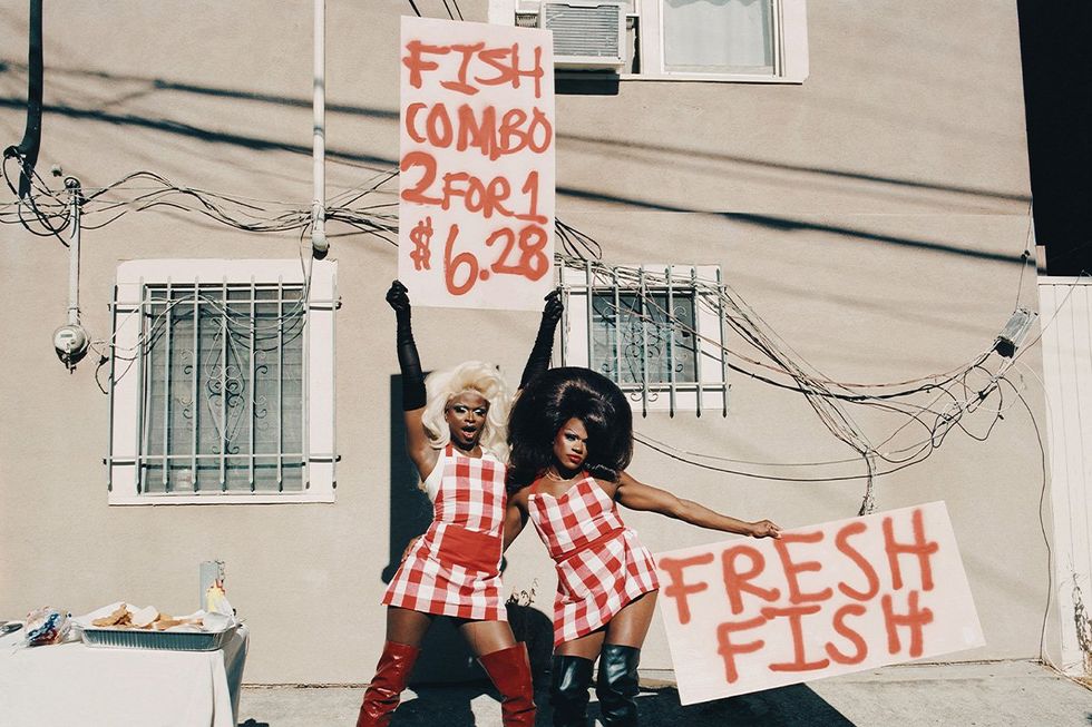 Their resulting shoot together has a playful camp element (serving fish from a stand is an obvious gag). But there are layers of meaning with more serious import. For example, the price of the fish sandwich, $6.28, refers to the date the first brick was thrown at Stonewall. And there was transformation happening behind the scenes.