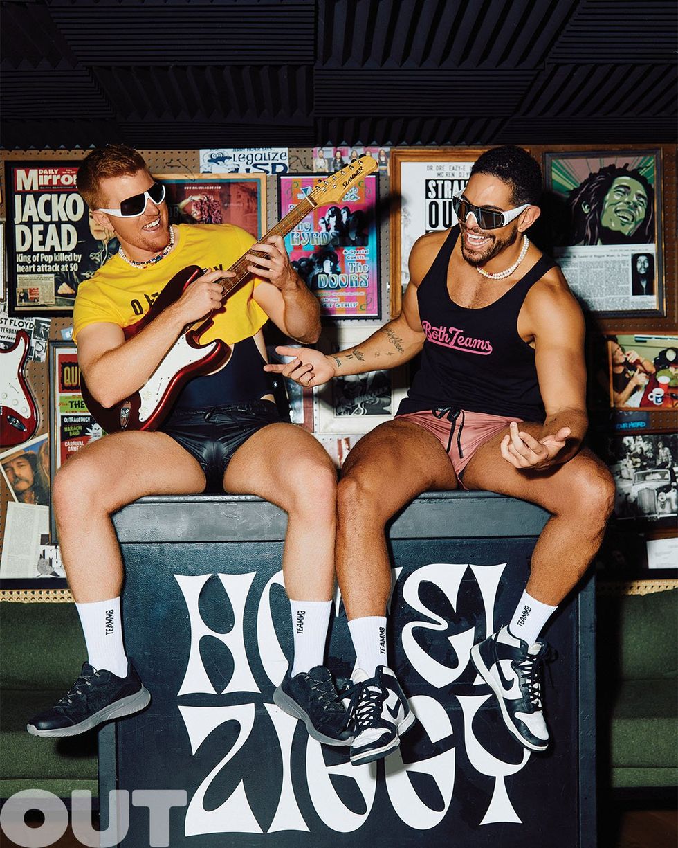 BRYCE: MONCLER Sunglasses; ANDREW CHRISTIAN Bodysuit; MANSION DE PERLE Necklaces; THE PRIDE STORE T Shirt; TEAMM8 Shorts and Socks; SUBJECT’S OWN Shoes; BRUNO: MONCLER Sunglasses; MANSION DE PERLE Necklaces; THE PHLUID PROJECT Tank; TEAMM8 Shorts and Socks; NIKE Shoes