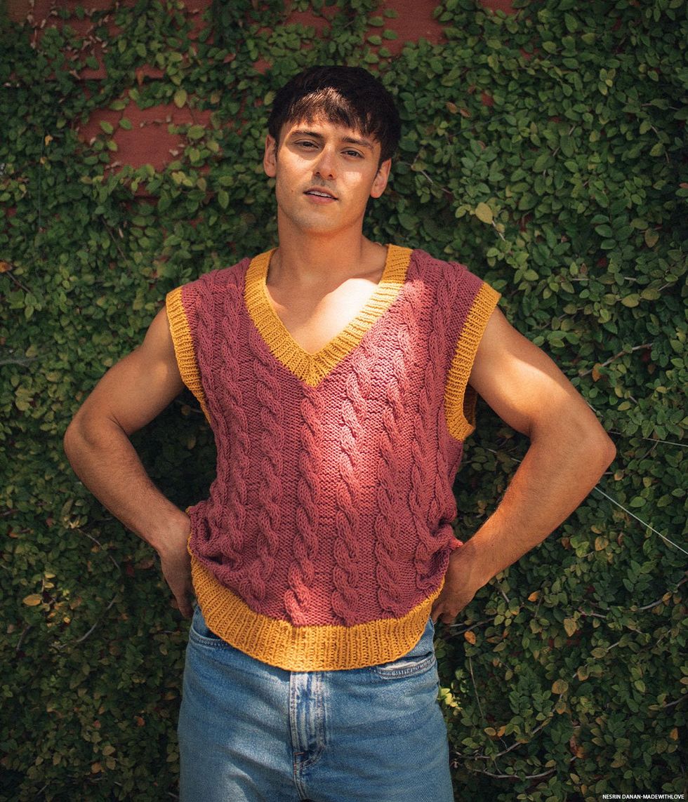 But Daley — who has become the veritable poster child of all things knitting after going viral at the Tokyo Olympics in 2021 when he took his crafty hobby poolside — looks effortlessly put together as he sits on the porch in his blue-and-white, checker-patterned sweater vest (no shirt underneath), paired with blue jeans and Chucks. He’s making a point that handmade knits can be sported all year long — and one can look cool while doing it.