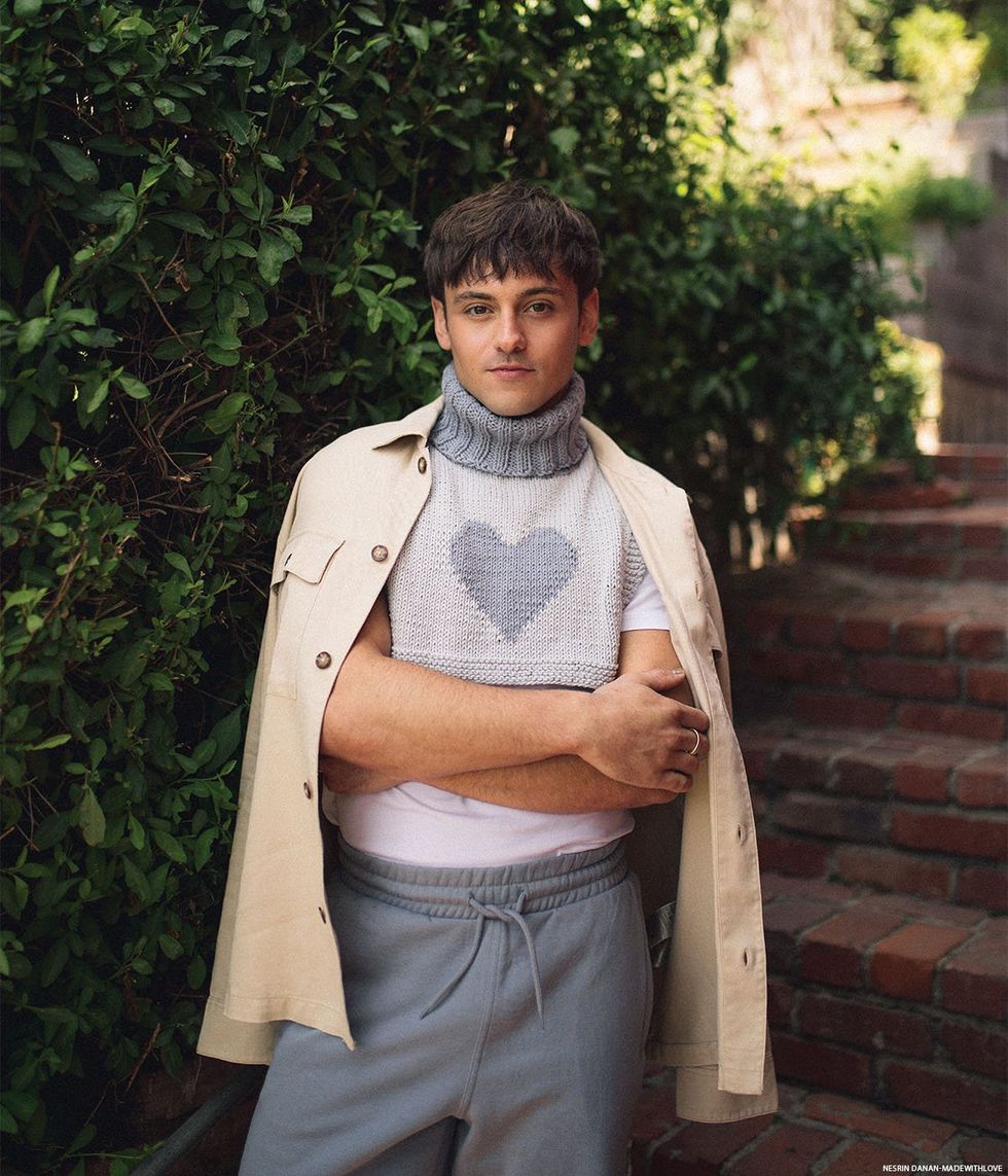 It’s the middle of summer in Los Angeles, and Tom Daley is wearing a knitted sweater vest.