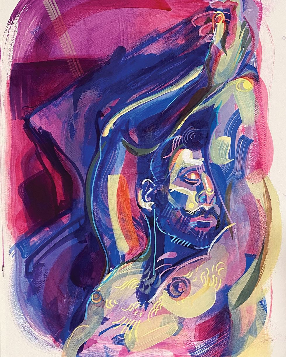 During the three-month stay, I built friendships, networks, had uninterrupted time to do research on the history of erotic art, and [worked] with live models, practicing classic figure drawing, sketching, painting and photographing. The time given helped me to try new techniques and approaches to my creative flow. I continued with my illustrated Bathroom Selfies, which is an ongoing series of intimate portraits made with my audience on social media. Everybody is capable of pleasure, so everybody is worthy of it. Everyone is worthy of a sexy portrait, all shapes and sizes.
