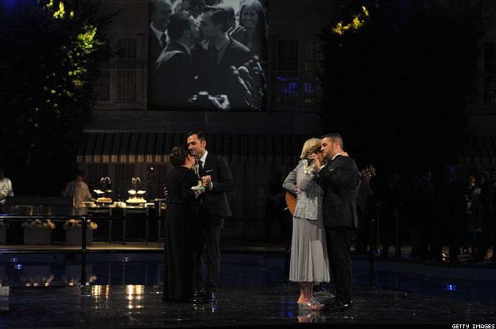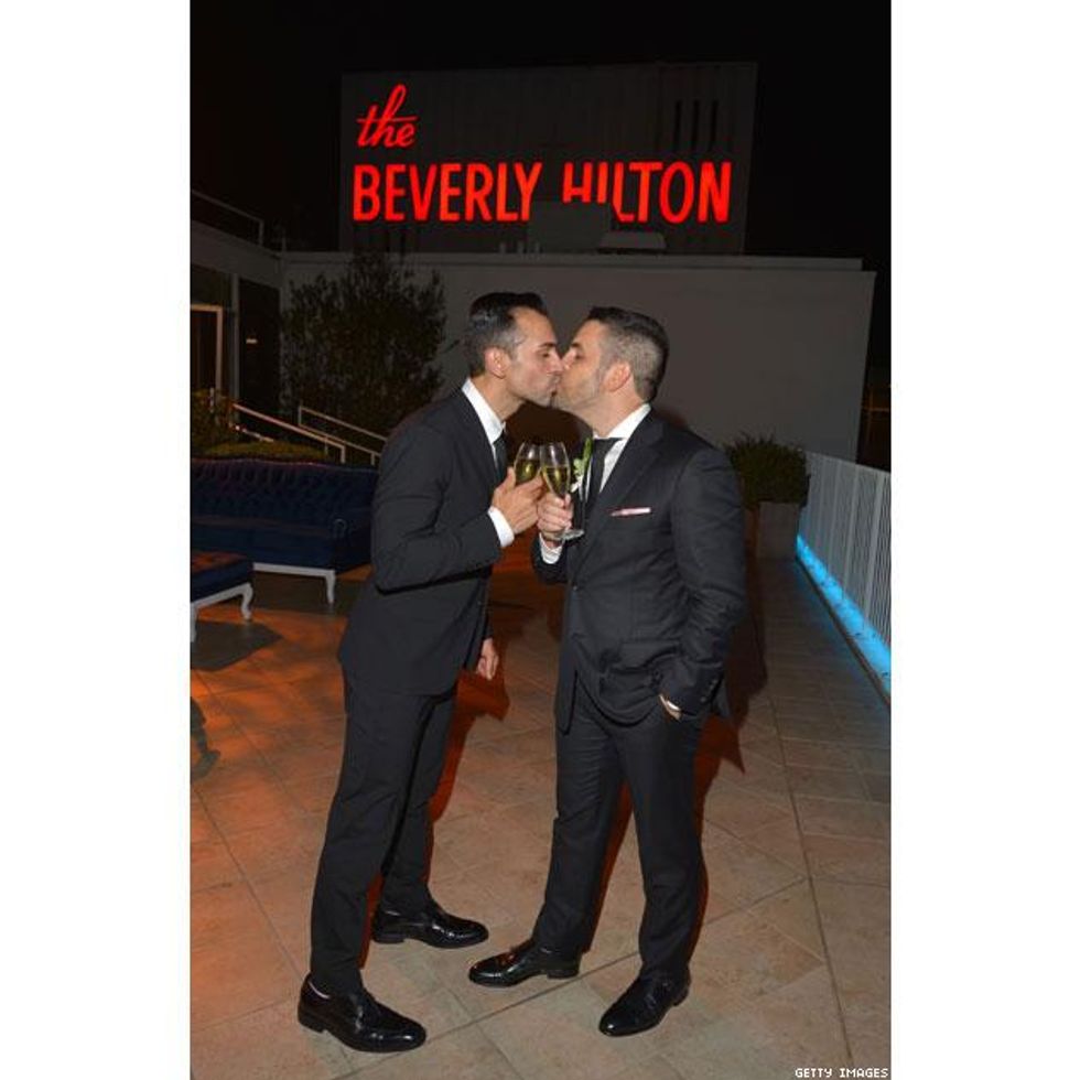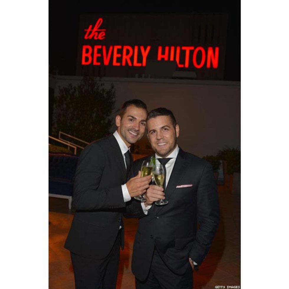 Saturday night's star-studded event included all four plaintiffs and their famously "odd couple" attorneys as well as celebrities and activists ranging from straight allies Rob Reiner and Jamie Lee Curtis to out actors Wilson Cruz, Alc Mapa, and Lance Bass, who attended with his fiance, Michael Turchin. The celebration was hosted by the Beverly Hilton Hotel and Shiraz Events and sponsored by Moet & Chandon, Danhov Rings, Luna Garden Events, the American Foundation for Equal Rights, and Joanie & Leigh's Cakes.