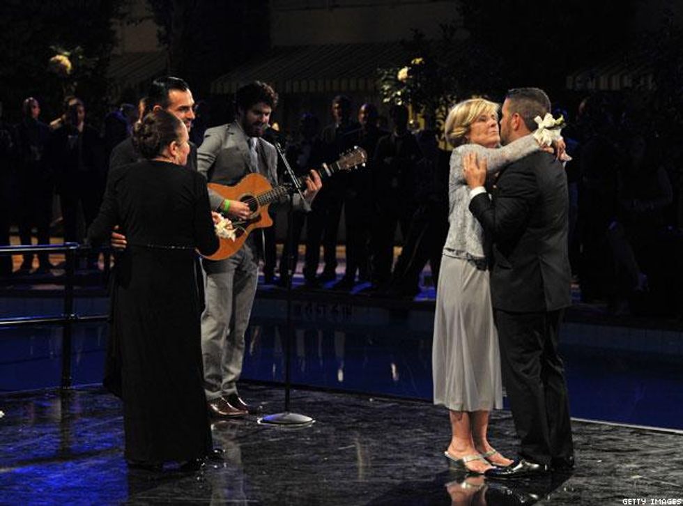 Throughout the evening, enthusiastic cheers and shouts of congratulations from the 235 guests permeated the poolside patio at the Los Angeles hotel, never more fervent then when Katami and Zarrillo exchanged emotional, unique vows on a stage that jutted out into the center of the Beverly Hilton's pool. Candles floated in the water as the newlyweds exchanged rings in a heartfelt ceremony officiated by Olson and Boies.