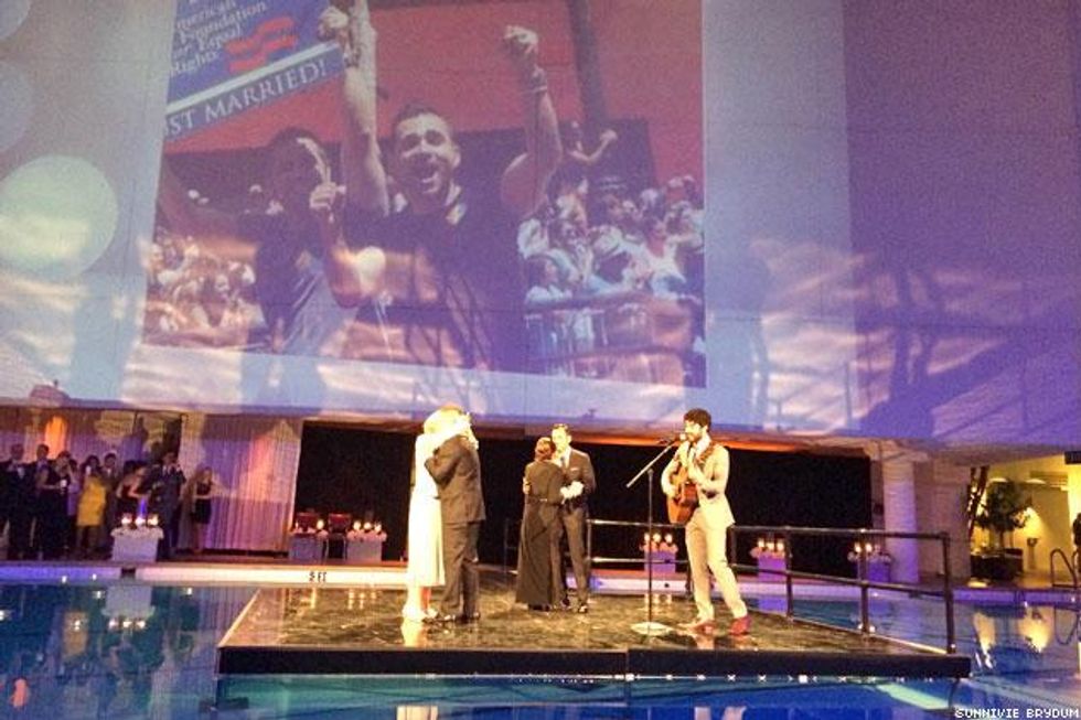It's been more than five years since the case was first argued in U.S. District Court in San Francisco; at the time it was known as Perry v. Schwarzenegger. And it's been just over one year since the decision in that case, written by now-retired U.S. District Judge Vaughn Walker (who attended Saturday's celebration) was ultimately upheld by the U.S. Supreme Court. Over that time, the plaintiffs "became our friends, our family, and our heroes," attorney Boies said as he officiated the couple's ceremony Saturday.