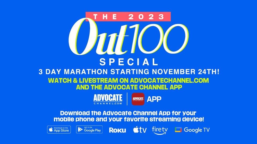 We're thrilled to announce that the Out100 TV Special will be available for non-stop 3-Day Streaming Marathon, November 24 - November 26 on the Advocate Channel App (on mobile and smart TV devices) and AdvocateChannel.com livestreams. Don't miss out on this exclusive 3-day streaming marathon experience. And fear not – if you can't catch it live, the Out100 Special will be available on-demand on the Advocate Channel App beginning November 27.