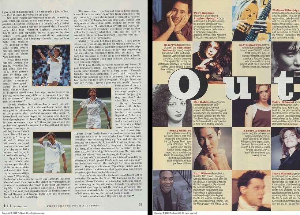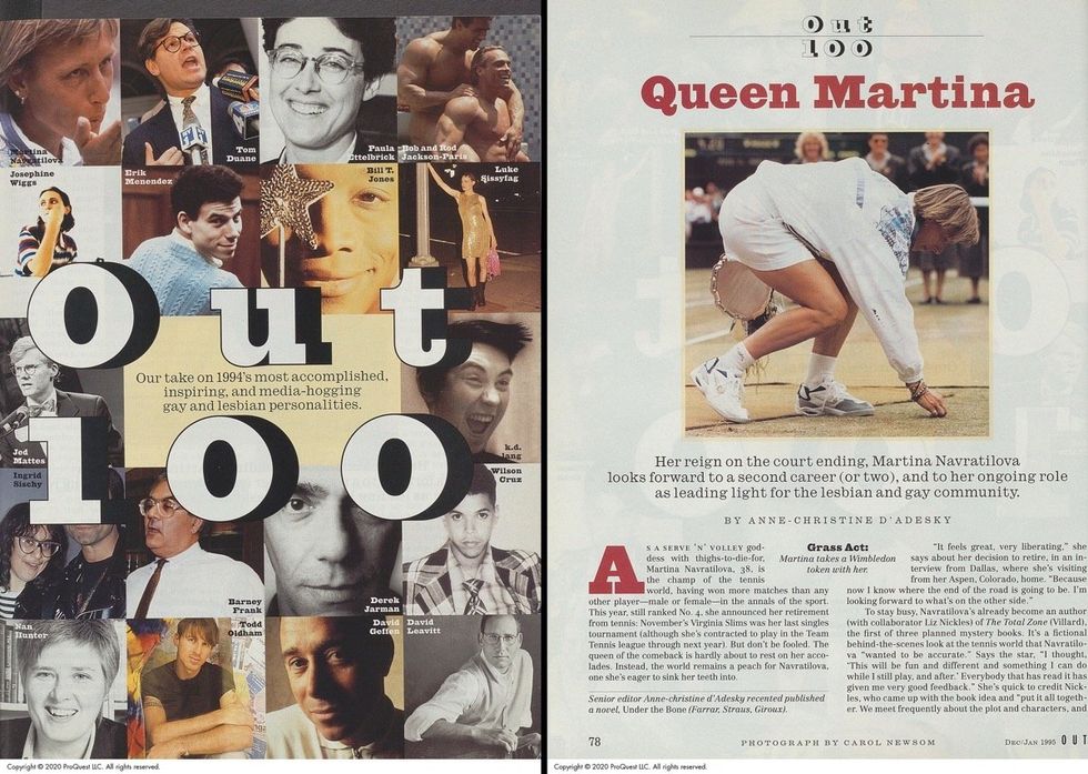 At the time, Navratilova spoke to Out about her interest in pursuing fiction writing, or perhaps acting, following her impending retirement. While she did go on to publish the two books she mentioned in her interview (a third was already out at the time), that was the end of her foray into publishing fiction. She did, however, publish two additional non-fiction books — one about staying in shape and another collecting stories about growing up gay in the U.S. — and appeared in a three-episode arc on Ryan Murphy's The Politician in 2019.