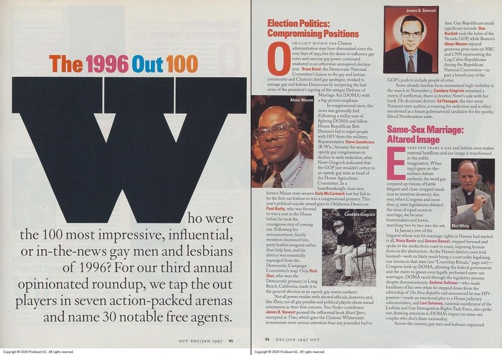 That dichotomy was reflected in how society responded to the push for visibility and rights throughout the year. The Out100 list bluntly called the 1996 Congressional races "generally bad," as out candidates lost again and again. Meanwhile, Americans seemed to be responding to the appearance of out and proud celebrities with less rancor.