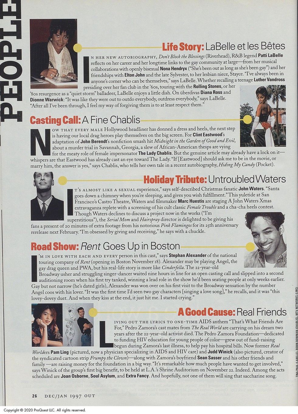 The December 1996/January 1997 issue of Out also included a divisive figure on the cover — political writer Andrew Sullivan. A conservative who had already been pushing for the legalization of same-sex marriage for years, Sullivan denounced DOMA and came out publicly as HIV-positive that April. It was just two years after he had platformed claims that race and IQ are genetically linked in his role as editor for The New Republic.